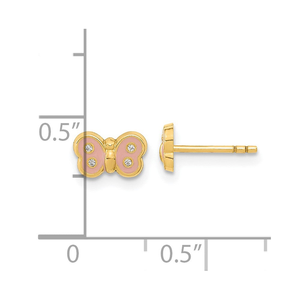 Discover the stunning 14K Yellow Gold Madi K Polished Enameled & CZ Butterfly Post Earrings, a perfect blend of elegance and fun. These earrings feature a vibrant pink enamel accent and are adorned with eight clear cubic zirconia stones that add sparkle. Crafted from high-quality 14K gold, they have a polished finish that shines with every move. Designed for little ones, the button-style posts with screw backs ensure a secure fit. With their bright colors and durable build, the 14K Yellow Gold Madi K earrings make a charming addition to any jewelry collection and are a great choice for young girls.
