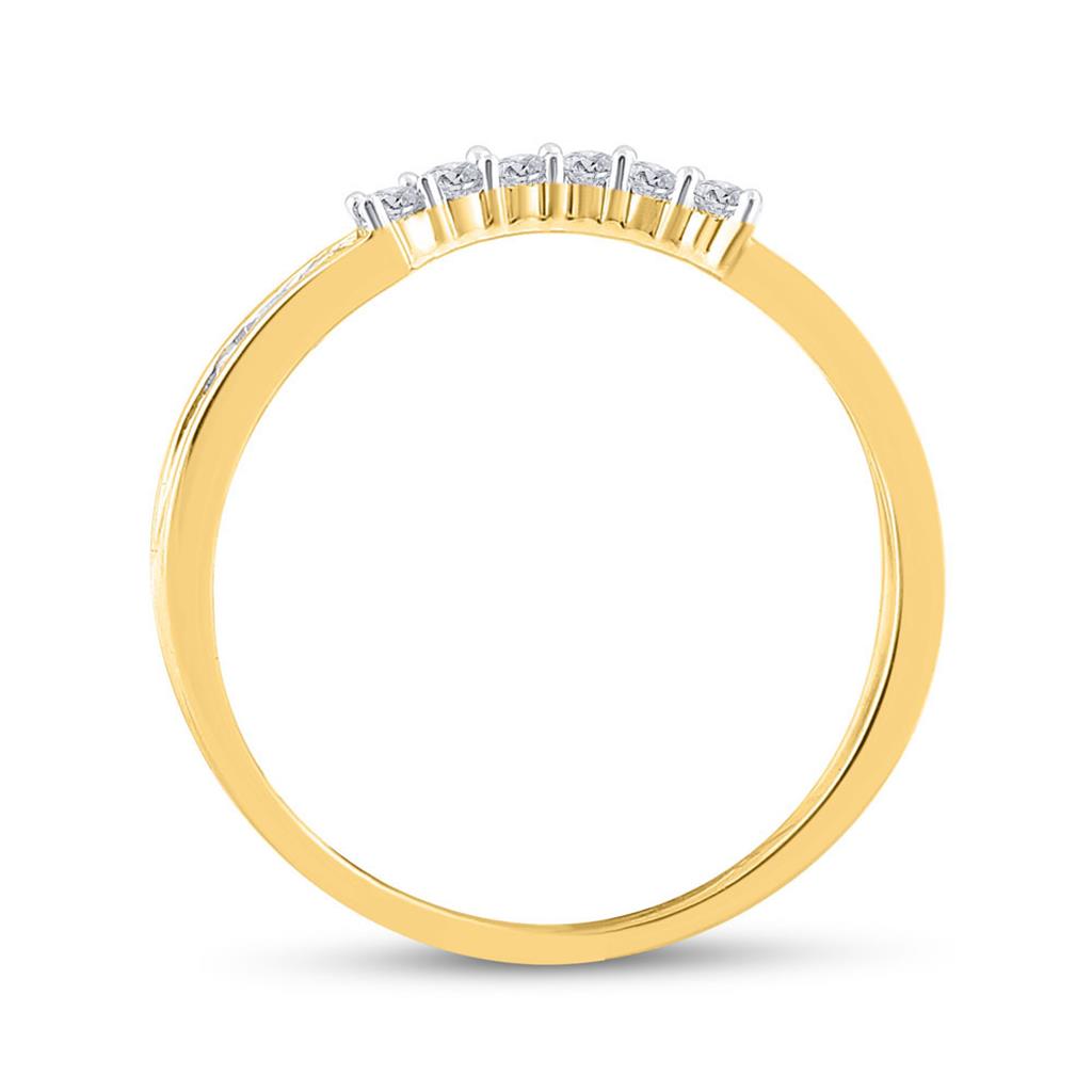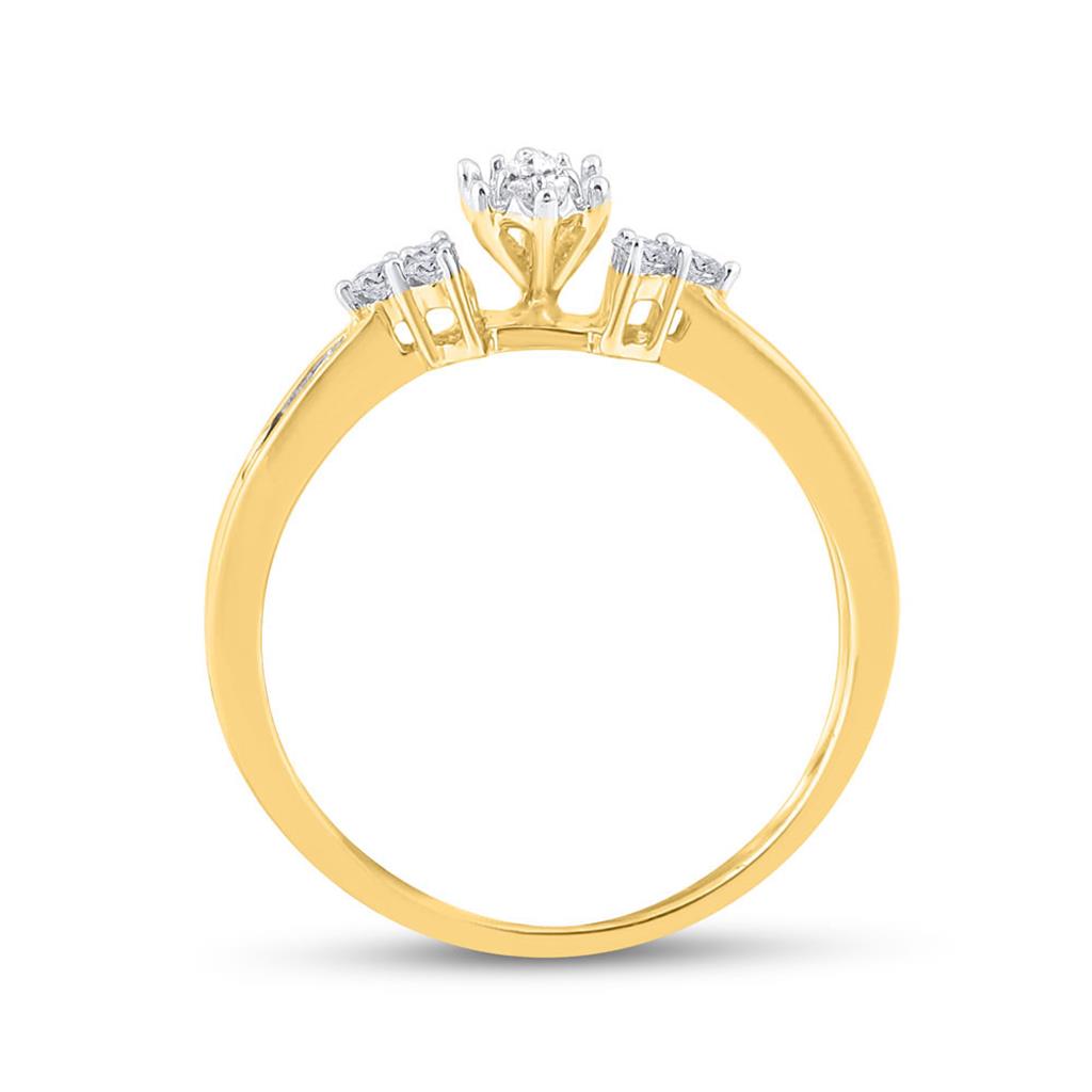 This bridal wedding ring set is made of 14kt yellow gold with a total weight of 3.87 grams. The set features a marquise-cut diamond as the primary gemstone with a carat weight of 0.09, and is set in a 6-prong setting. Two types of diamonds are used as accent stones in the set; pave-set round diamonds with a carat weight of 0.24, and channel-set round diamonds with a carat weight of 0.17. The diamond color for all gems is G-H, and the clarity is I1-I2. This set is certified and boasts an impressive total gemstone carat weight of 1/2.