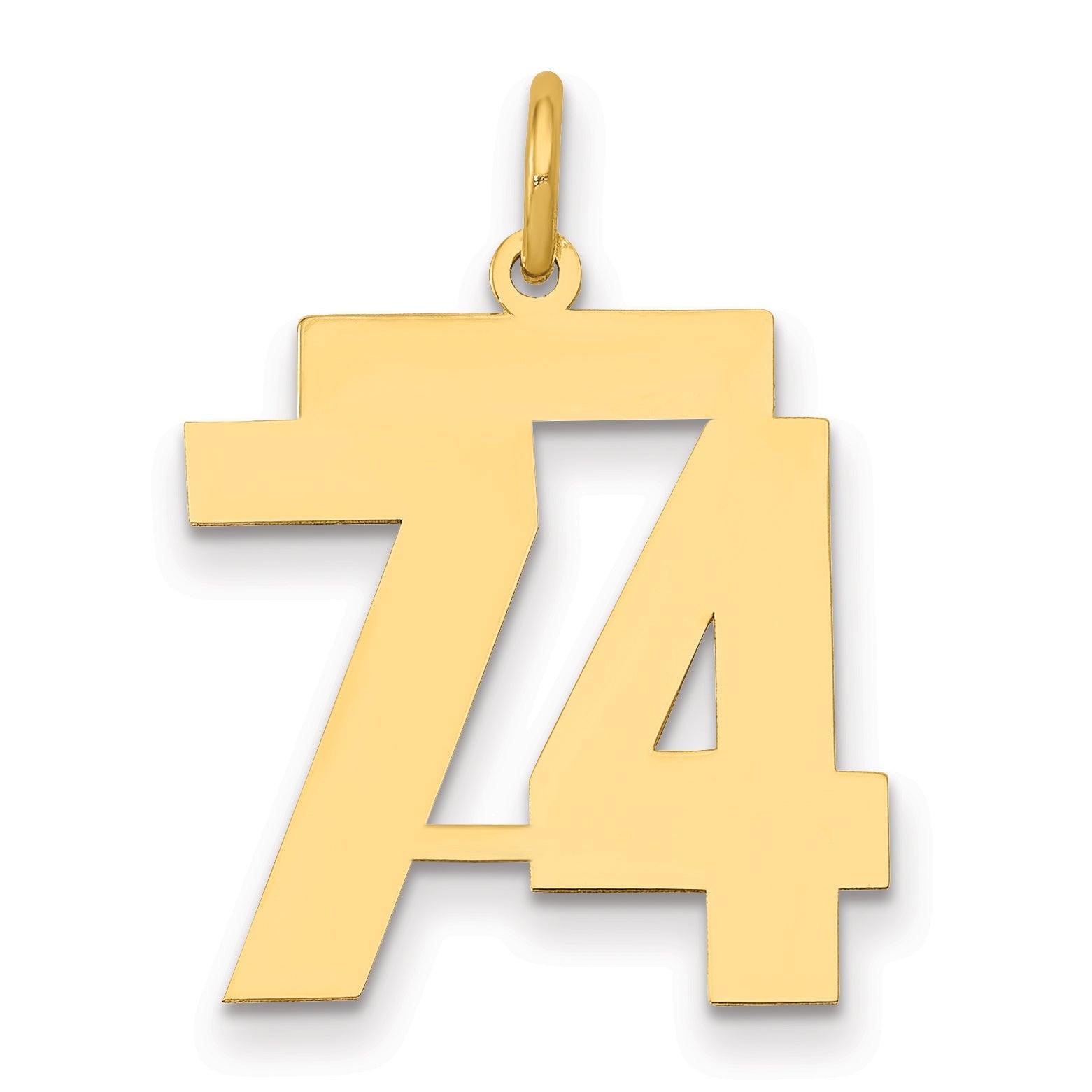 Introducing the 14K Yellow Gold Medium Polished Number 74 Charm, a great piece for anyone who loves unique jewelry. Crafted from high-quality 14K gold, this charm offers a smooth, polished finish that shines with simple elegance. Its laser-cut design gives it a clean look that’s perfect for stacking or wearing alone. The medium size makes it versatile, fitting well on necklaces or bracelets. Whether you want to mark a special date or just add a stylish touch, the Number 74 Charm from our jewelry collection is a solid choice. It’s a piece you'll love to wear every day.