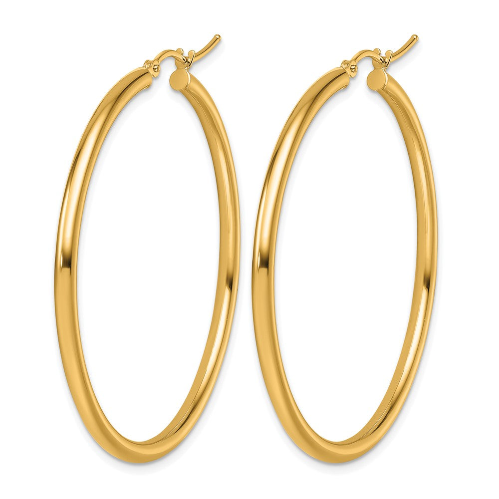 The 14K Yellow Gold Polished 2.5mm Lightweight Tube Hoop Earrings are perfect for daily wear. Crafted from pure 14K gold, these hoops have a sleek polished finish that adds shine. Measuring 45 mm in length, they are lightweight and comfortable for all-day use. The hollow design keeps them light without sacrificing style, while the sturdy wire and clutch closure ensures they stay secure. These gold hoops blend simplicity with elegance, making them versatile for any look. The 14K Yellow Gold Polished 2.5mm Lightweight Tube Hoop Earrings come with a lifetime guarantee, so you can enjoy their charm for years.