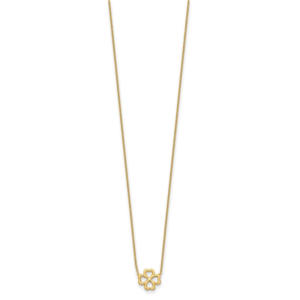 The 14K Yellow Gold 14K Polished 4-Leaf Clover with 2-Inch Extender Necklace is a charming way to add some luck to your look. Crafted from genuine 14-karat gold, it features a shiny finish that catches the light beautifully. The necklace measures 19 inches long, with a 17-inch chain and a handy 2-inch extender for a perfect fit. The cute four-leaf clover pendant, at 9.75 mm, is lightweight and eye-catching, making it great for everyday wear or special occasions. This jewelry piece is made to last and comes with a lifetime guarantee, making the 14K Yellow Gold 14K Polished 4-Leaf Clover necklace a true treasure.