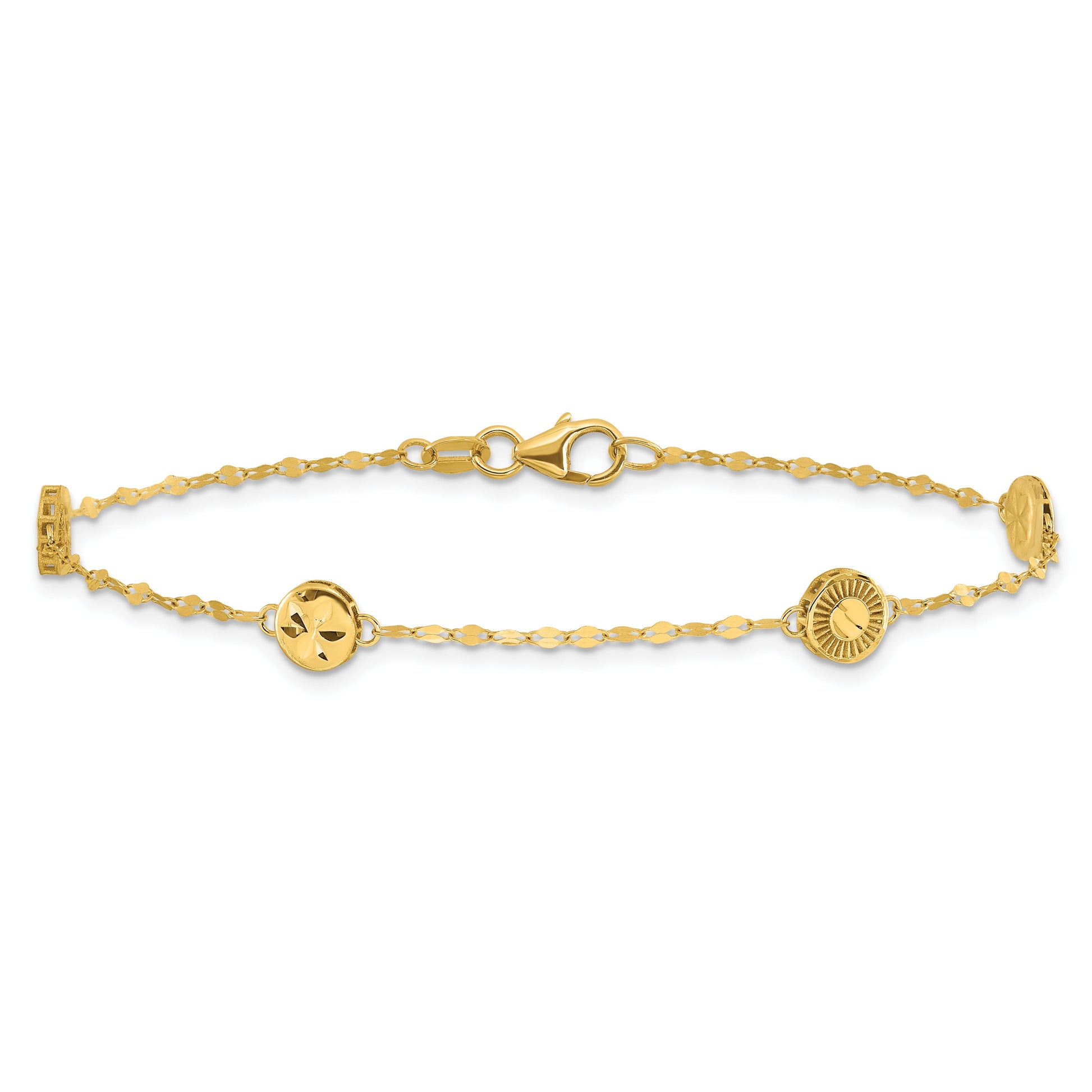 The 14K Yellow Gold 14K Polished and Diamond-Cut Disc Design Bracelet offers a sleek and bright look for any woman’s collection. With its high-polish finish and eye-catching diamond-cut discs, this piece shines from every angle. The 7.5-inch chain fits comfortably and feels lightweight on the wrist. Crafted from pure 14K gold, it combines durability with elegance. The lobster clasp ensures a secure fit, while the fancy disc charms add a unique touch. Perfect for daily wear or special occasions, the 14K Yellow Gold 14K Polished and Diamond-Cut Disc Design Bracelet boasts a lifetime guarantee, making it a timeless piece to cherish.