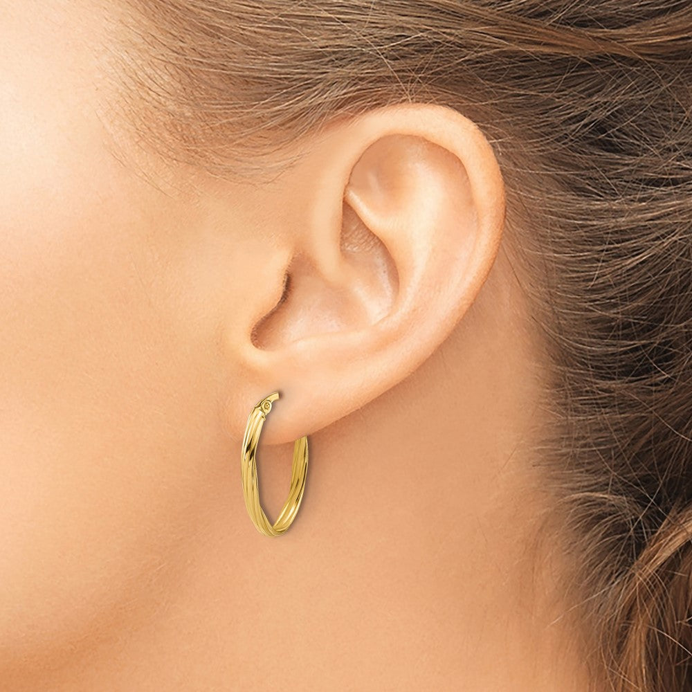 The 14K Yellow Gold Polished and Grooved Twist Oval Hoop Earrings are a stylish choice for everyday wear. Crafted from pure 14K gold, these earrings feature a smooth, shiny finish with a twisting design that adds a touch of flair. Measuring about 23.35 mm in length and 16.5 mm wide, they fit comfortably and make a bold statement. The unique twisting pattern highlights their modern look, while the durable wire and clutch closure keep them secure. These earrings come with a lifetime guarantee, making them a reliable, eye-catching addition to your jewelry collection.