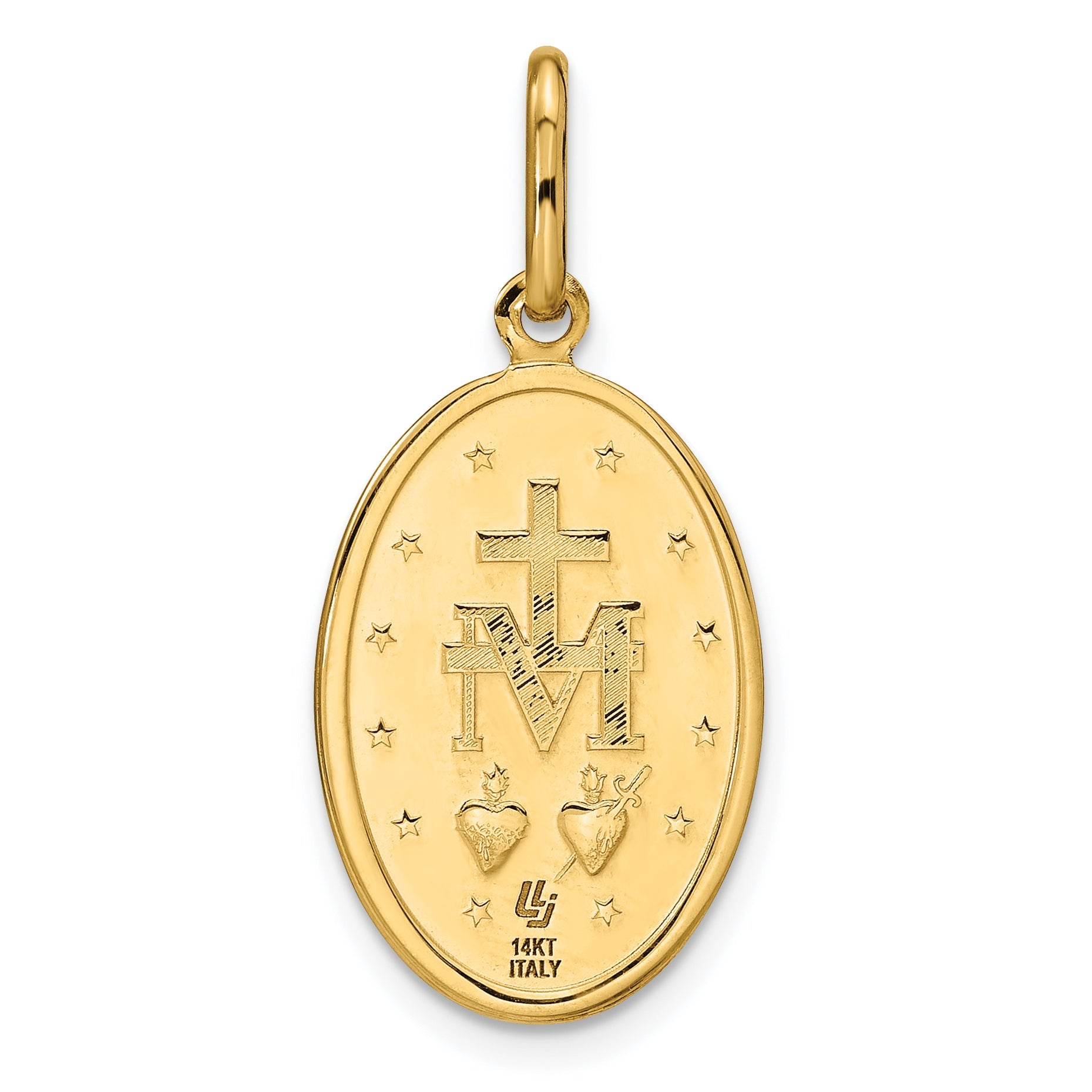 The 14K Yellow Gold Polished And Matte Oval Miraculous Medal is a stunning piece that blends elegance with faith. Crafted from high-quality 14K gold, this medal features both polished and brushed finishes for a rich look. It measures 30 mm long, with the charm itself at 20.6 mm by 14 mm. The satin texture adds subtle shine, while the gold bail measures 1.5 mm wide. Designed to last a lifetime, the medal feels light yet durable, making it perfect for daily wear. The 14K Yellow Gold Polished And Matte Oval Miraculous Medal serves as a thoughtful gift or a meaningful addition to your jewelry collection.