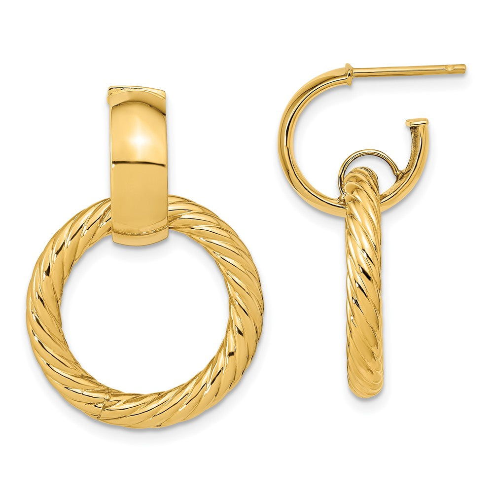 The 14K Yellow Gold Polished and Textured Fancy Dangle Post Hoop Earrings stand out with their stylish design and flawless craftsmanship. Crafted from bright 14K yellow gold, these earrings feature a striking combination of polished and textured surfaces, adding a touch of elegance to any ensemble. Measuring 29.32mm in length and 20.5mm in width, they offer a bold yet refined look that's perfect for both casual and formal occasions. Their post and push-back closure ensures a secure fit. Elevate your jewelry collection with these stunning 14K Yellow Gold Polished and Textured Fancy Dangle Earrings.