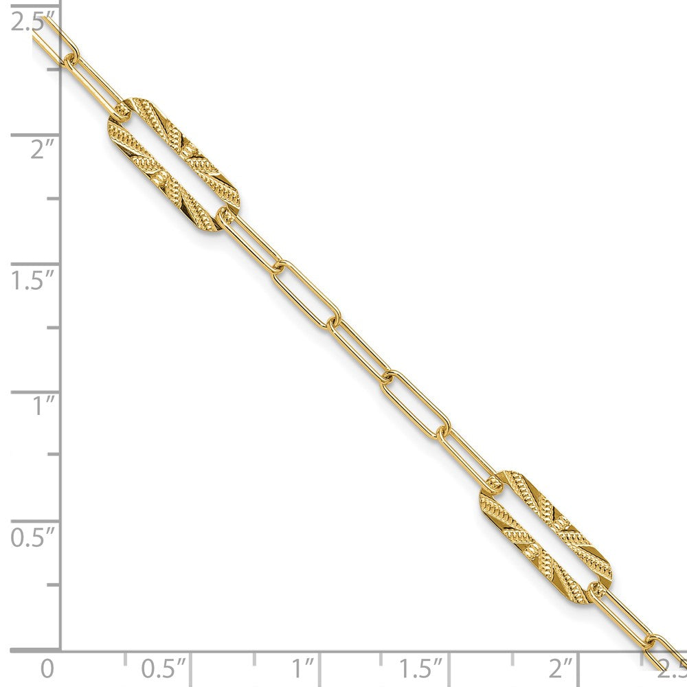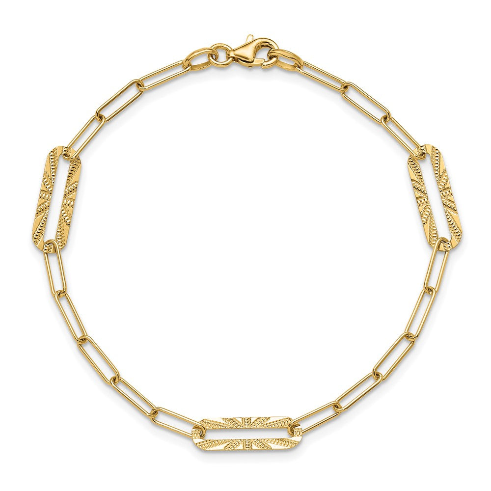 Discover the 14K Yellow Gold Polished and Textured Fancy Link Bracelet, a standout piece for any jewelry box. Crafted from solid 14K gold, it combines a smooth polished finish with a textured design that adds depth and style. The bracelet measures 7 inches long with a 5.32 mm wide fancy chain, making it perfect for women who want a lightweight yet sturdy accessory. Its lobster clasp ensures a secure fit, and the durable build promises lasting shine. The 14K Yellow Gold Polished and Textured Fancy Link Bracelet offers timeless elegance and a lifetime guarantee, making it a must-have jewelry piece.
