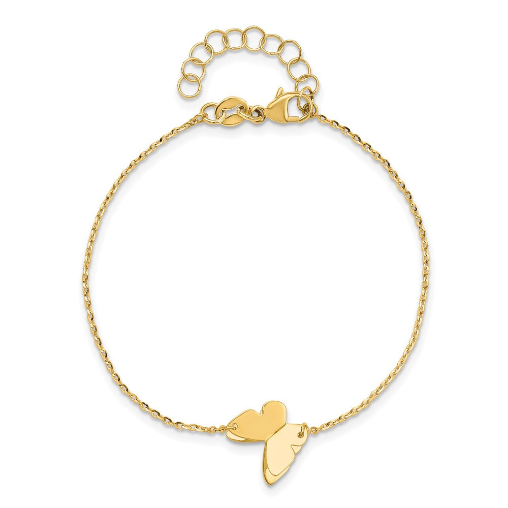 The 14K Yellow Gold Polished Butterfly Charm with a 1-Inch Extender Bracelet is a charming way for women to add sparkle to their look. Crafted from high-quality 14K gold, this bracelet features a shiny butterfly charm measuring 10.5 mm by 11.5 mm that dangles beautifully. The sleek cable chain, 6.25 inches long with a 1-inch extender, ensures a comfortable fit while showing off the detailed charm. This jewelry piece is perfect for everyday wear or special occasions, adding a touch of elegance and fun. The 14K Yellow Gold Polished Butterfly Charm with a 1-Inch Extender Bracelet comes with a lifetime guarantee, making it a treasured gift or personal keepsake.