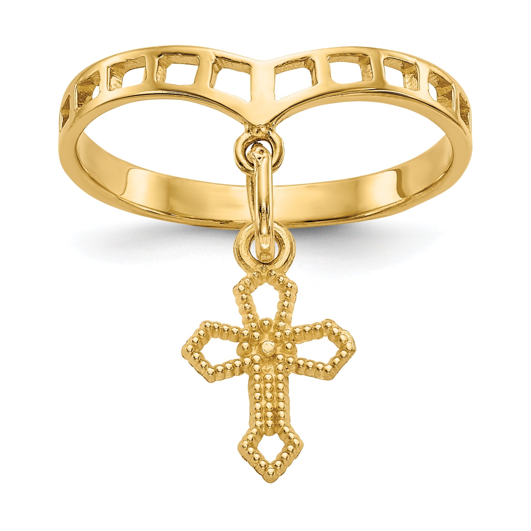 The 14K Yellow Gold Polished Cross Dangle Charm Ring adds a touch of elegant charm to any outfit. Crafted from 14K gold, this ring boasts a polished finish that captures the light beautifully. The dainty 2 mm band is both delicate and comfortable for everyday wear. A cross dangle charm hangs from the ring top, which measures 17 mm in length, offering a stylish twist to a timeless symbol. This themed piece makes a meaningful statement, flawlessly merging faith with fashion. Embrace sophistication with the 14K Yellow Gold Polished Cross Dangle Charm Ring.