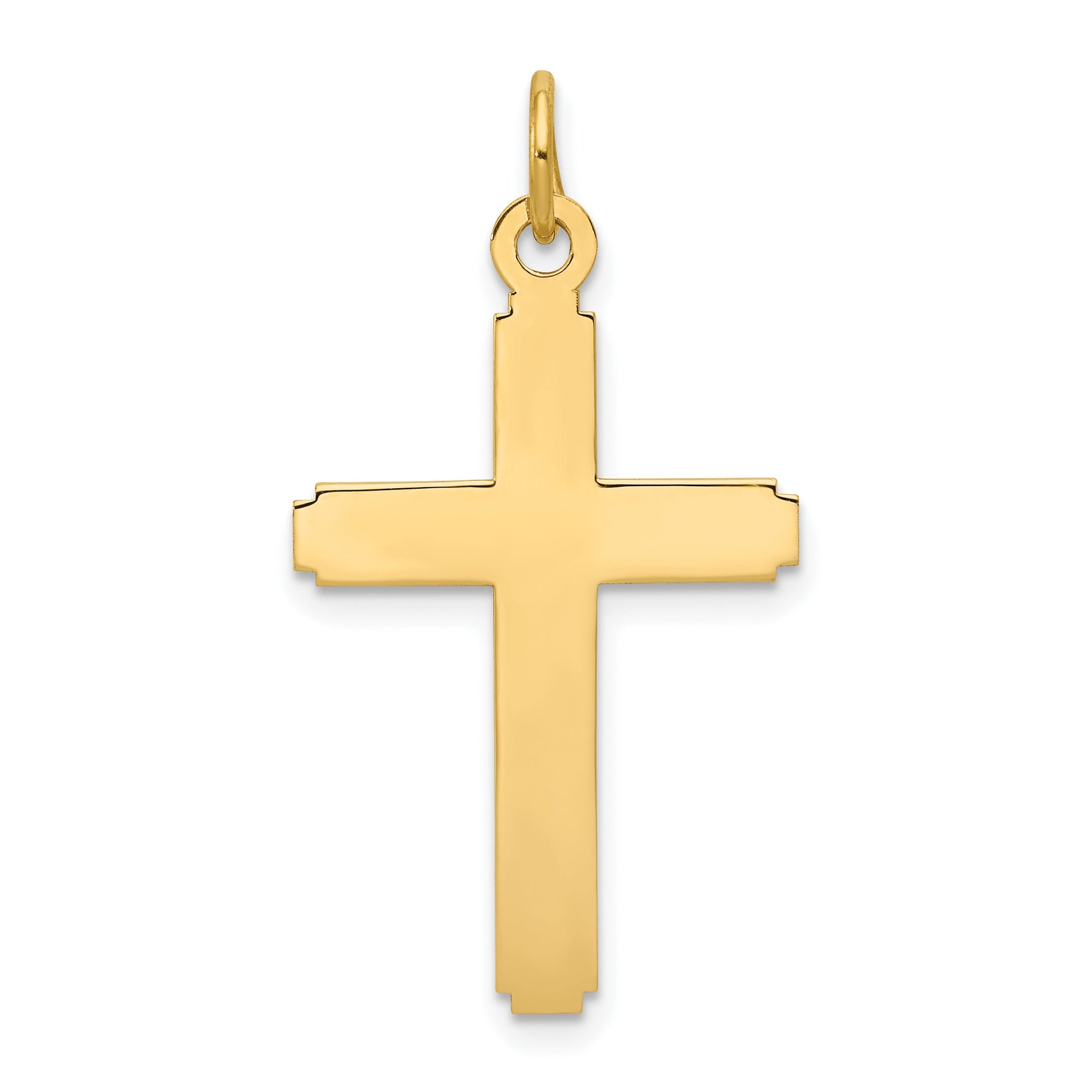 The 14K Yellow Gold Polished Cross Pendant is a masterpiece in timeless elegance. Crafted from 14K gold, this pendant boasts a brilliant polished finish that gleams with every turn. Measuring 28 mm in length and 14 mm in width, it strikes the perfect balance between subtlety and statement. The classic flat back design ensures it rests comfortably against the skin. This jewelry piece makes for a thoughtful gift or a cherished addition to any collection. Own the 14K Yellow Gold Polished Cross Pendant and let its shining beauty speak for itself.