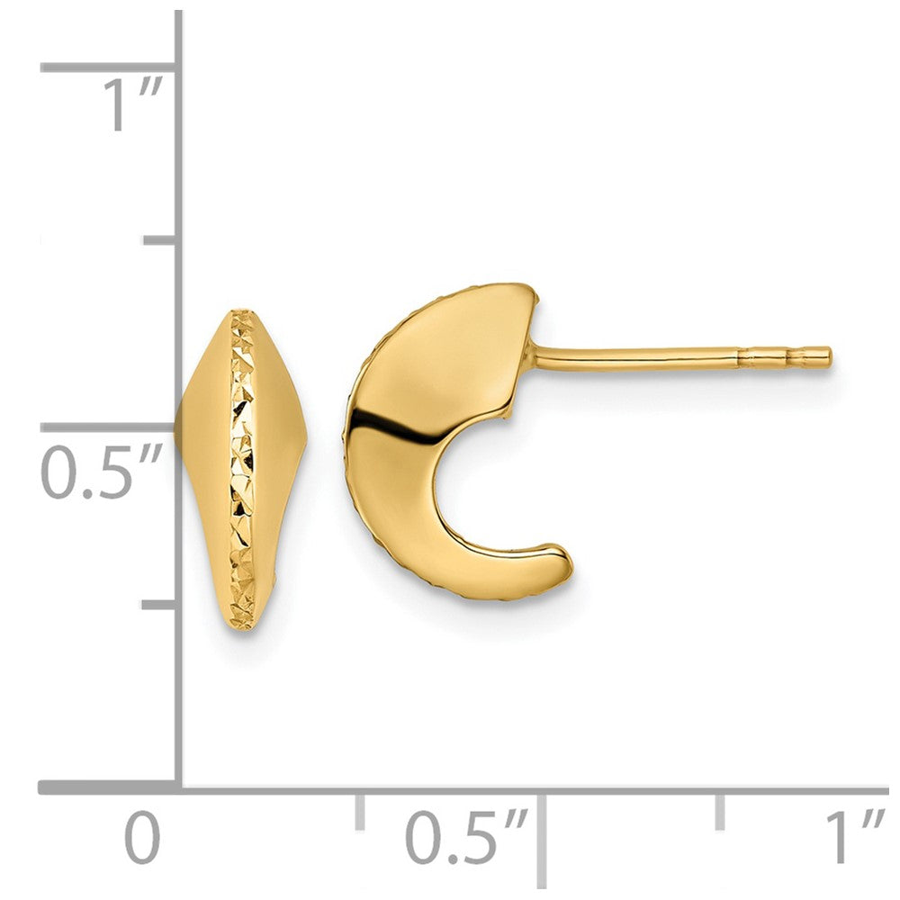 Add a touch of class to your look with these 14K Yellow Gold Polished Diamond-Cut Knife Edge J-Hoop Post Earrings. Crafted in genuine 14K gold, they shine with a radiant yellow hue. The earrings measure 11.5 mm in length and have a textured diamond-cut finish, adding intrigue to the design. The knife edge and hollow style reduce weight without skimping on style. A post and push-back closure ensures a secure fit for everyday wear. Perfect for women who appreciate elegantly styled hoop earrings, these J-Hoop beauties are a staple for any jewelry collection.