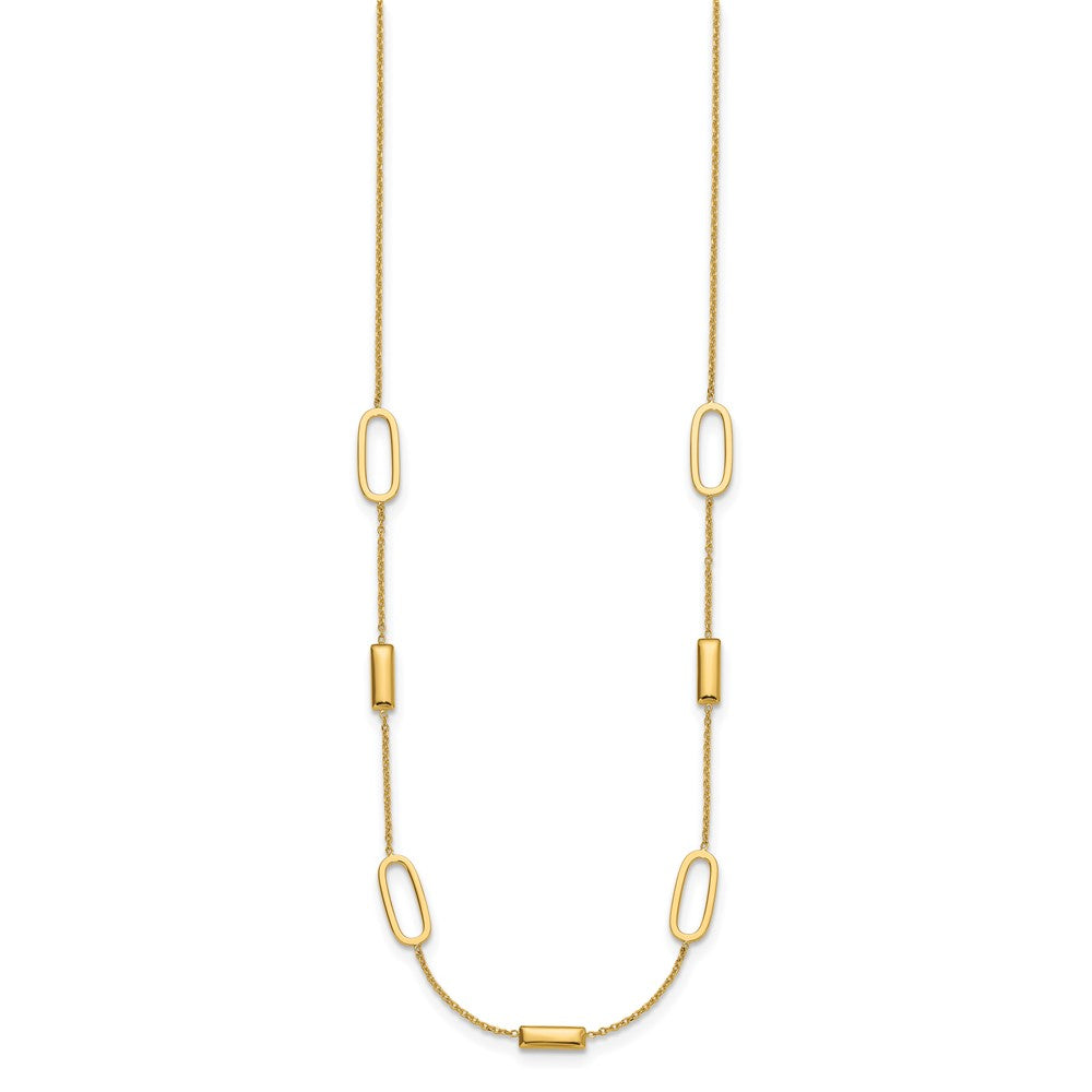 Add a pop of gold to your style with the 14K Yellow Gold Elongated Oval and Bar Necklace. Crafted from pure 14K gold, this necklace shines with a polished finish that catches the light beautifully. Its sleek, lightweight design makes it comfy for all-day wear. The 18-inch chain features a 16-inch length with a 2-inch extender, giving you flexible fit options. The fancy lobster clasp ensures your necklace stays put. With seven elegant elements, the comfortable and durable design makes the 14K Yellow Gold Elongated Oval and Bar Necklace a perfect addition to any jewelry collection.