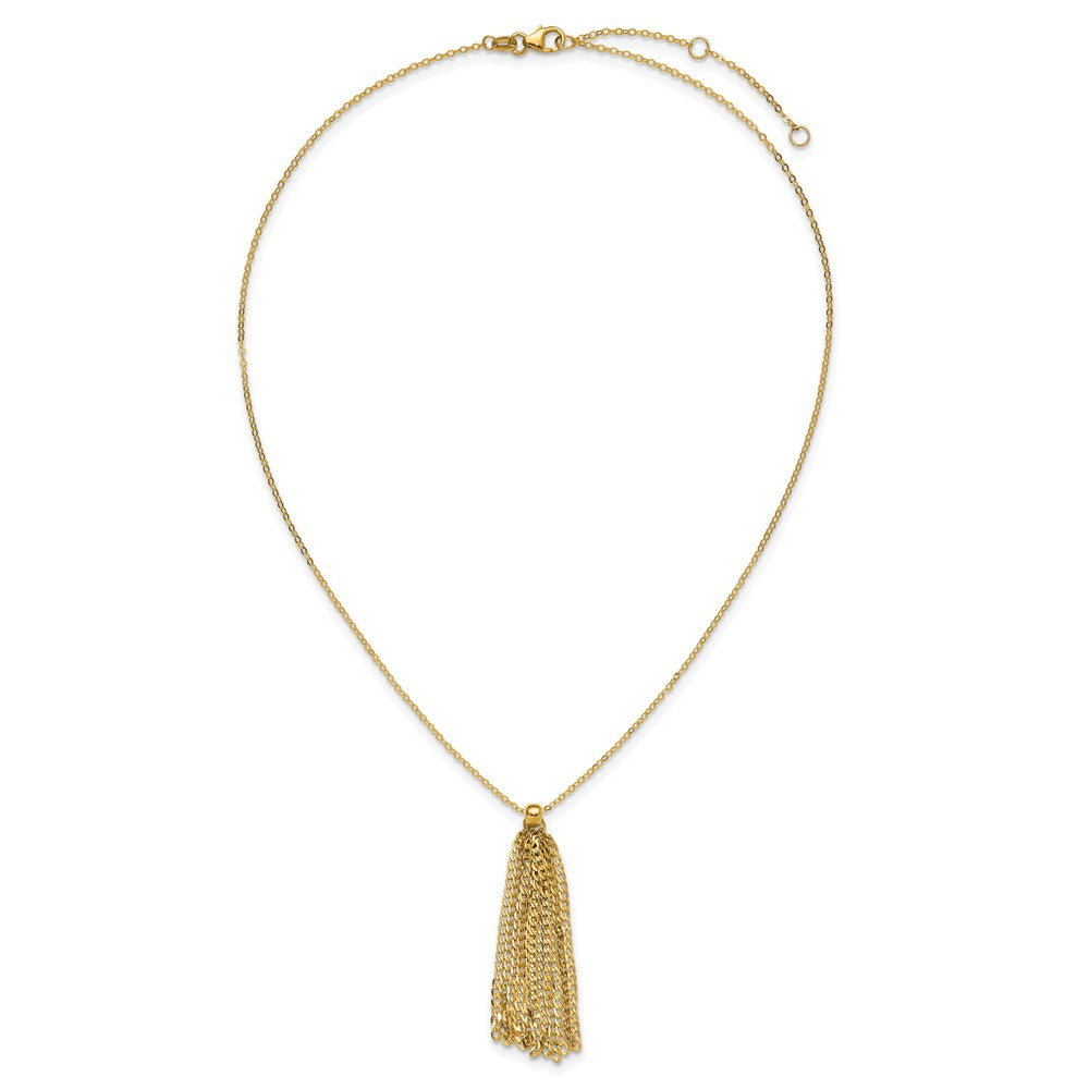 The 14K Yellow Gold 14K Polished Fancy Curb Link Tassel Necklace is a sleek and stylish piece that adds charm to any look. This necklace measures 16 inches with a 2-inch extension for a perfect fit, offering comfort and flexibility. Its polished curb chain features a movable tassel pendant, which measures 51.3 mm long and 4.3 mm wide, giving it a bold yet refined feel. Crafted from high-quality 14K gold, this necklace boasts lasting shine and elegance. Lightweight and durable, the necklace is finished with a secure lobster clasp and comes with a lifetime guarantee, making the 14K Yellow Gold 14K Polished Fancy Curb Link Tassel Necklace a stylish addition to your jewelry collection.