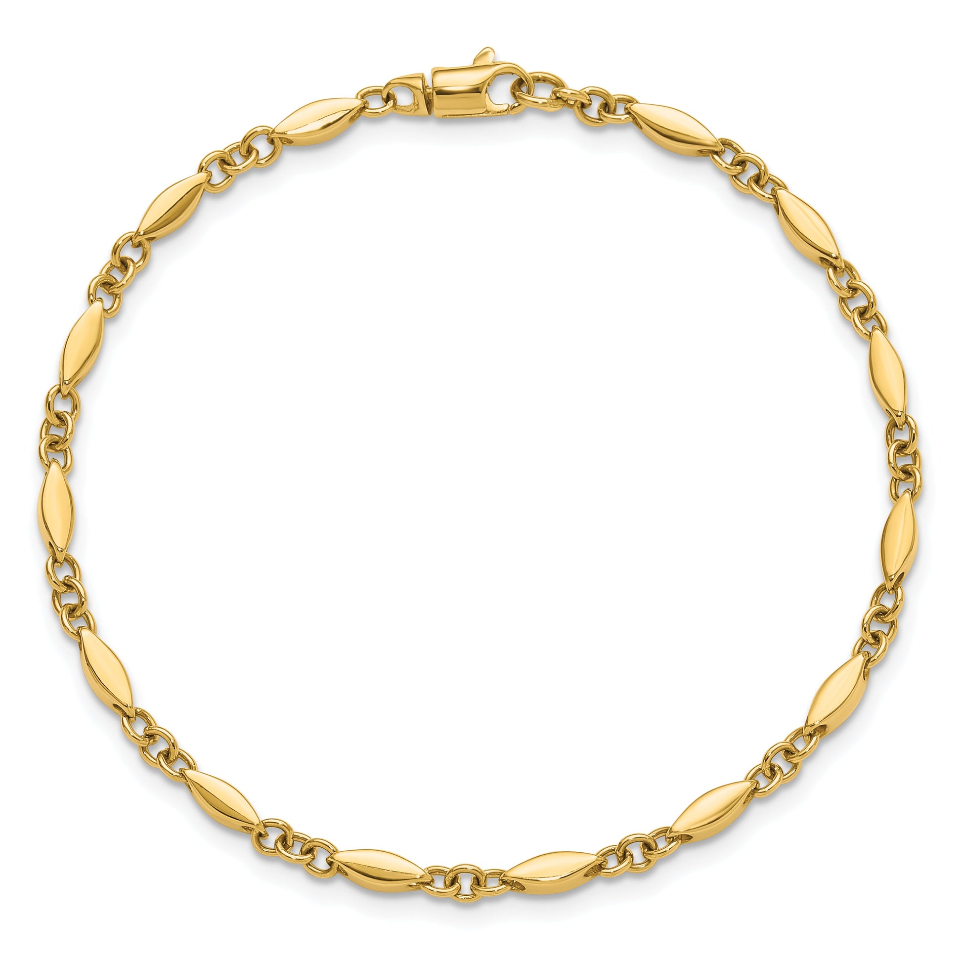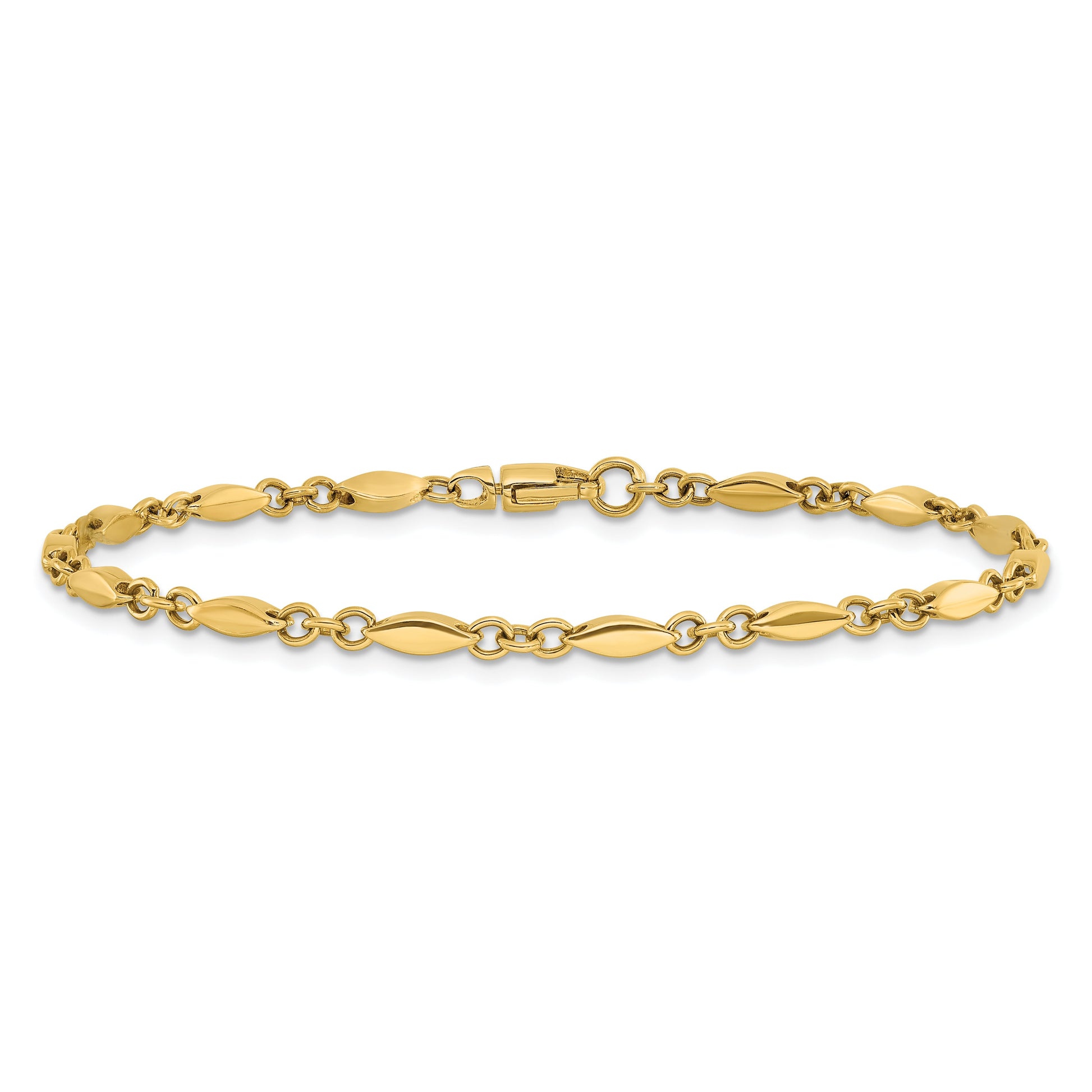 The 14K Yellow Gold Polished Fancy Link Bracelet is a must-have for jewelry lovers. Crafted from solid 14K gold, this bracelet offers a bright shine and sleek look. Its 7.25-inch chain with stylish links sits comfortably on your wrist. The lobster clasp keeps it secure, while the 2.5mm width adds a subtle touch of elegance. Perfect for everyday wear or special occasions, this unisex bracelet blends quality with style. The bracelet comes with a lifetime guarantee, ensuring lasting beauty. The 14K Yellow Gold Polished Fancy Link Bracelet is a timeless piece that elevates any outfit.