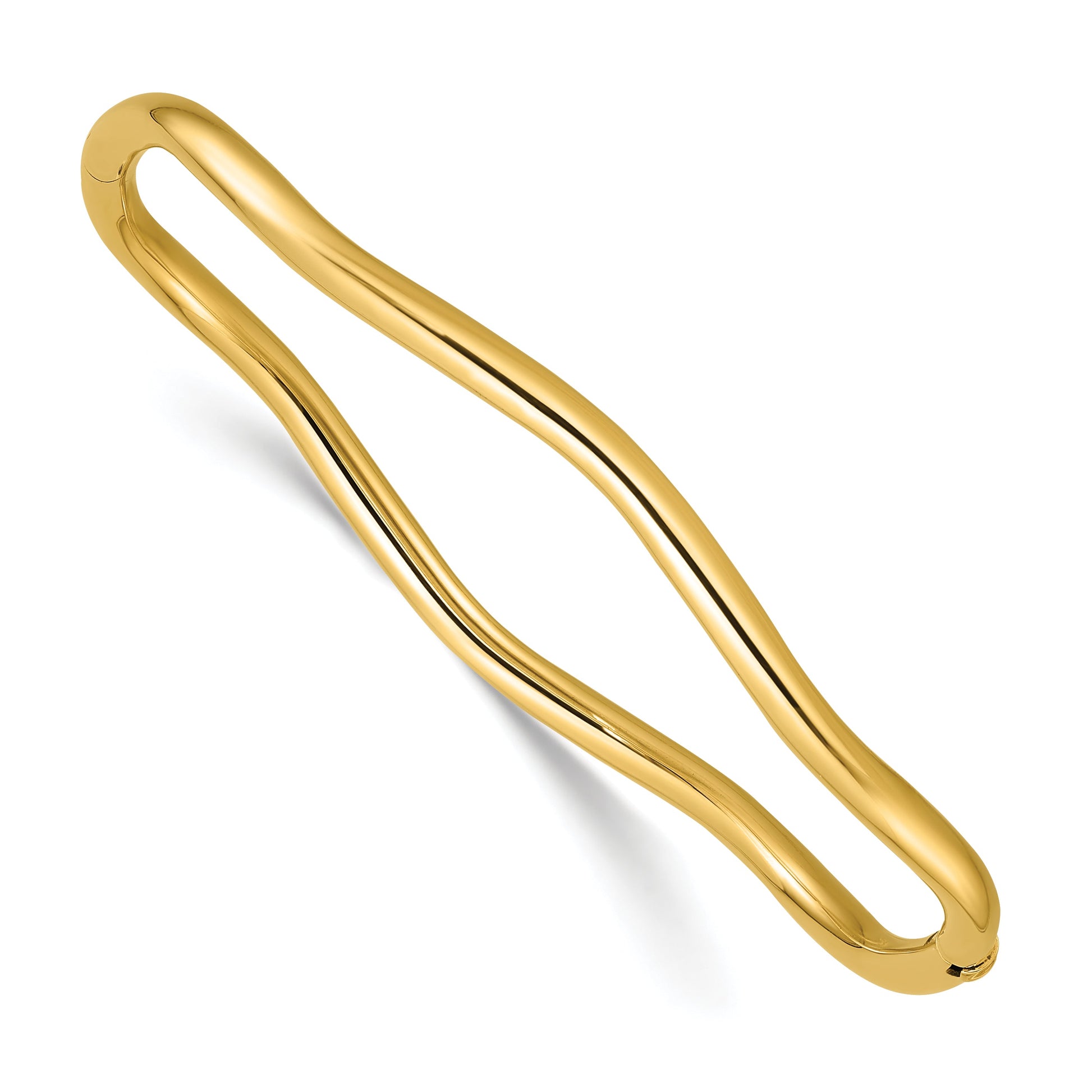 Discover the stunning 14K Yellow Gold Polished Fancy Wavy Hinged Bangle, a perfect piece for everyday elegance. Crafted with solid 14K gold, this bracelet features a sleek polished finish that catches the light beautifully. The wavy design adds a unique touch, while the hinged clasp makes it easy to wear and take off. With a sturdy box catch, this bangle stays secure on your wrist. It’s durable, stylish, and built to last, backed by a lifetime guarantee. Elevate your jewelry collection with the timeless charm of the 14K Yellow Gold Polished Fancy Wavy Hinged Bangle.