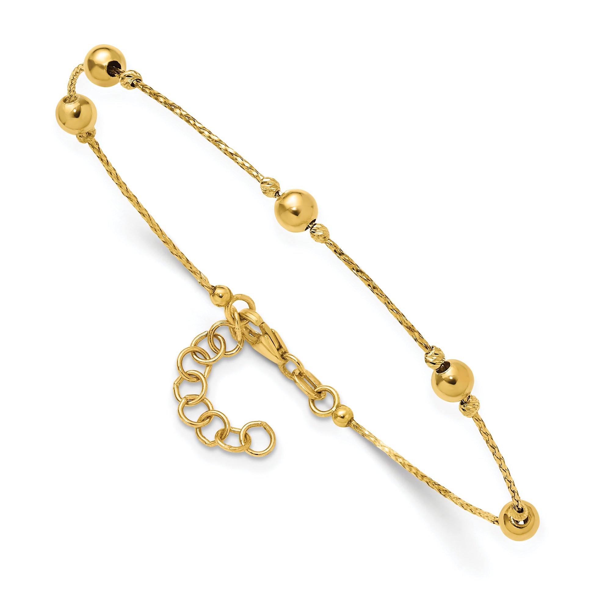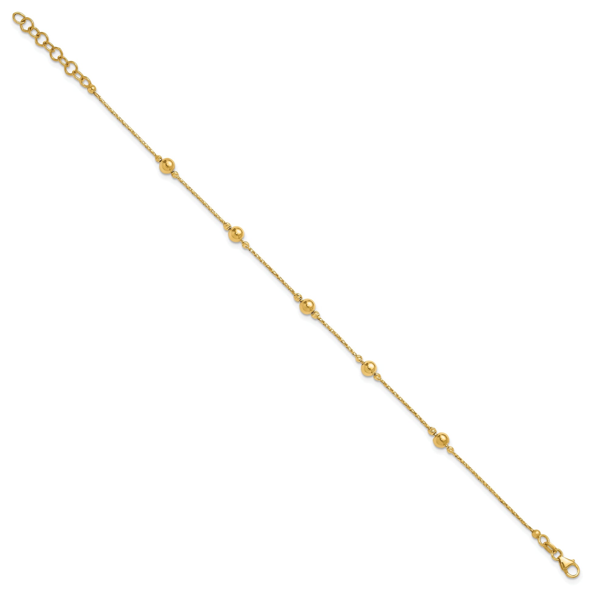 The 14K Yellow Gold 14K Polished/Textured/Dia-Cut Beads W/1In Ext. Bracelet is a stylish piece for everyday wear. It features shiny and textured beads with a diamond-cut finish, adding a touch of sparkle. The 8-inch chain has a 7-inch length with a 1-inch extender, making it fit comfortably. Crafted from lightweight gold, this bracelet feels nice on the wrist. The lobster clasp keeps it secure, and a lifetime warranty adds peace of mind. With five elegant beads, the 14K Yellow Gold 14K Polished/Textured/Dia-Cut Beads W/1In Ext. Bracelet is a clean, classic choice for your jewelry collection.