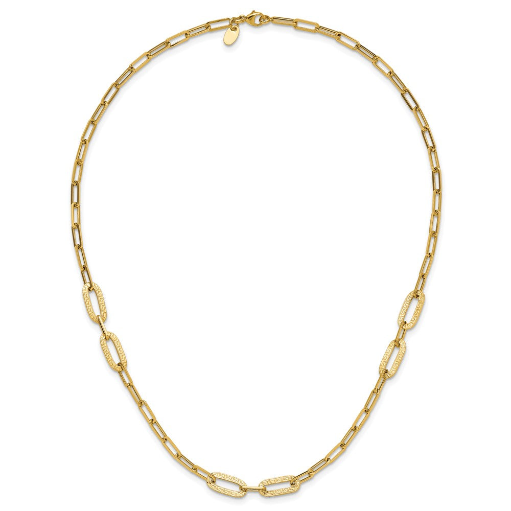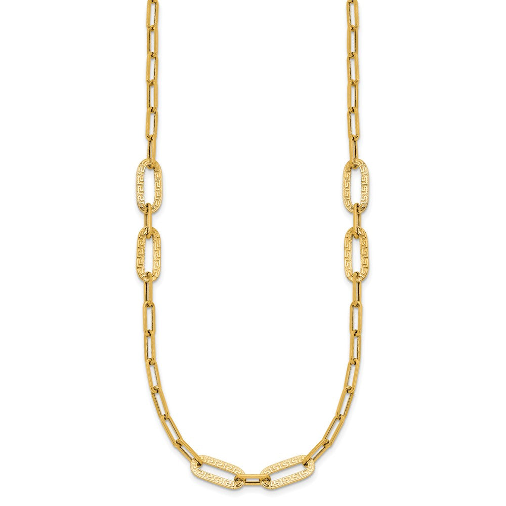 Make a statement with the 14K Yellow Gold Polished Textured Greek Key Paperclip Link Necklace. This bold piece showcases a sleek, modern design with a textured Greek key pattern. Crafted from pure 14K gold, it feels lightweight and sits comfortably on your neck. Its 18-inch length makes it perfect for everyday wear or special occasions. The shiny finish and sturdy lobster clasp give it a touch of class while staying durable. Whether for yourself or as a gift, the 14K Yellow Gold Polished Textured Greek Key Paperclip Link Necklace is a stylish choice to elevate any look.