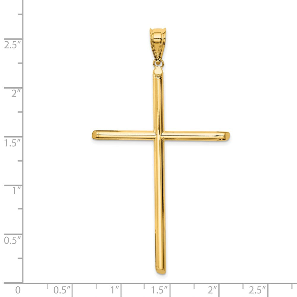 Introducing the elegant 14k Yellow Gold Polished Tube Cross Pendant! This stunning piece is made of premium quality 14k yellow gold with a weight of 2.24 grams. The pendant features a beautiful polished finish and measures at a length of 65.2 mm, with a charm/element length of 58.36 mm, a thickness of 2.7 mm, and a width of 36.6 mm. Its 3D design is created through a die-struck manufacturing process, resulting in a unique and detailed piece. Sold by unit, this pendant/charm is a themed jewelry item, perfect for adding a stylish touch to any outfit. The bail measures at 4.2 mm in width and 9.4 mm in length, and the pendant is presented in a charming yellow gold color. Get your hands on this exquisite 14k Yellow Gold Polished Tube Cross Pendant and elevate your jewelry collection today!