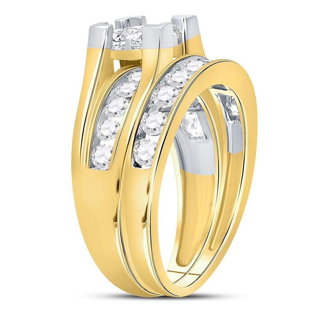 This exquisite wedding ring set boasts a stunning design crafted in 14kt yellow gold and weighing approximately 7.5504 grams. The set features a total gemstone carat weight of 1 and 1/2, with a primary diamond gemstone of princess shape, G-H color, and I2 clarity, elegantly set in an invisible setting. The secondary diamond gemstone of round shape, G-H color, and I2 clarity, is brilliantly channel-set, weighing 0.92 carats. The third gemstone in the set is of no carat weight. This is a truly precious and remarkable piece of jewelry perfect for your special day.