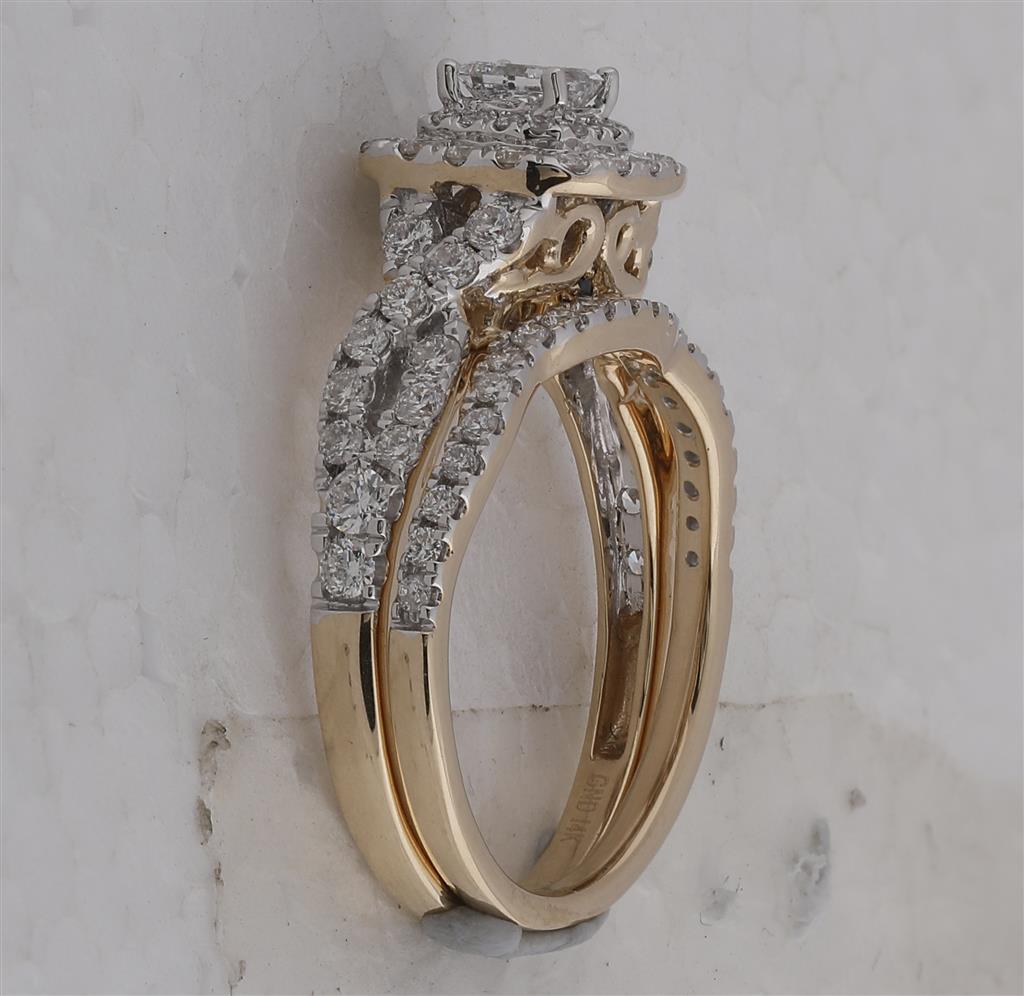This stunning wedding ring set features a 14kt yellow gold band with a total weight of 5.881 grams. The set is adorned with a total gemstone carat weight of 1 and 1/4, including a princess-cut diamond as the primary gemstone. The diamond is G-H in color and has an SI3 clarity rating, set in a 4-prong setting with a carat weight of 0.31. The band also features a round-cut diamond as the second gemstone, with a G-H color range, I1 clarity rating, prong-set, and a carat weight of 0.93. Completing the set is a natural blue sapphire as the third gemstone, with a round shape, a bright blue color, I1 clarity rating, prong-set, and a carat weight of 0.02. This exquisite bridal set comes with certification, ensuring the quality and authenticity of the gems and precious metal.