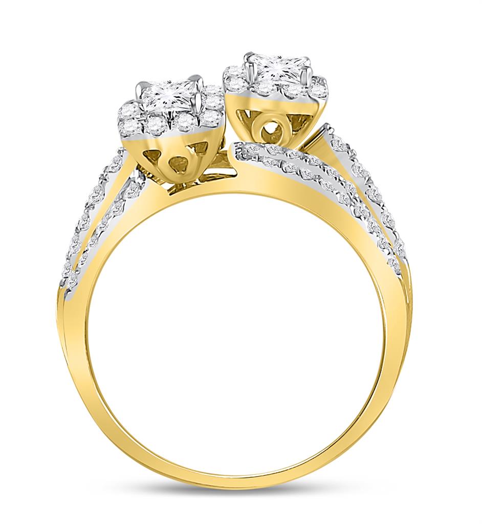 Introducing the stunning 14k Yellow Gold Princess Diamond Bridal Wedding Ring Set, boasting a total gemstone carat weight of 1. Crafted from the finest 14kt yellow gold, this exquisite ring weighs approximately 5.1696 grams. The primary gem of this ring is a gorgeous princess-cut diamond, with a color range of G-H and a clarity of I1, delicately prong-set to highlight its stunning beauty. The ring also features a second diamond, a round-shaped gem with a G-H color range and I1-I2 clarity, perfectly prong-set to complement the exquisite princess diamond. With a combined carat weight of 0.69, this ring is truly a statement piece. Gem 3 has not been included in the ring design. Make your special day unforgettable with this exceptional bridal wedding ring set.