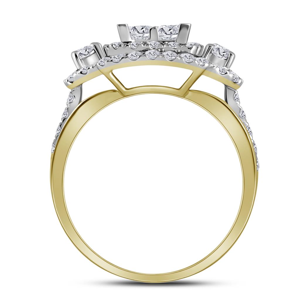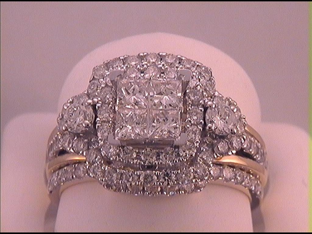 This is a bridal wedding ring set made of 14kt yellow gold. The entire set weighs 5.95 grams and has a total gemstone weight of 2 carats. The main diamond is princess cut with a color grade of G-H and a clarity grade of I1. It is set invisibly and weighs 0.66 carats. The second diamond is round cut with a color grade of G-H and a clarity grade of I1-I2. It is set in prongs and weighs 0.23 carats. The third diamond is also round cut with a color grade of G-H and a clarity grade of I2-I3. It is also set in prongs and weighs 1.09 carats.