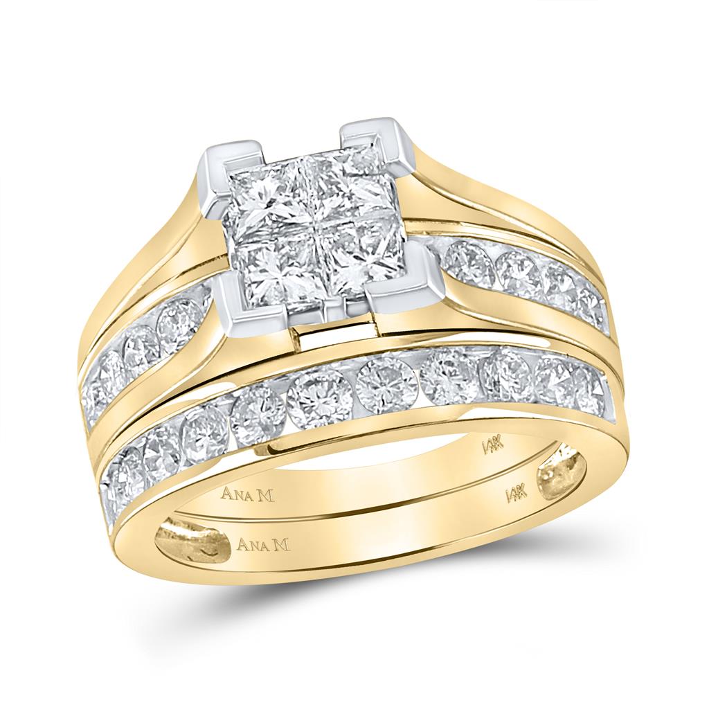 Introducing our stunning 14kt Yellow Gold Princess Diamond Bridal Wedding Ring Set, expertly crafted with a total gram weight of 8.75. Featuring a breathtaking 2 carat gemstone weight, the primary gem type is a gorgeous diamond in a dazzling princess cut, with a lustrous G-H color and I1-I2 clarity. The diamond is expertly placed in an invisible setting to showcase its brilliance. The stunning ring also includes a beautiful round diamond, with a G-H color and I1-I2 clarity, which is carefully set in a secure channel setting, with a total carat weight of 1.2. With its unforgettable design, this engagement ring set is the perfect way to flaunt your love and commitment. Gem 3 is not included.
