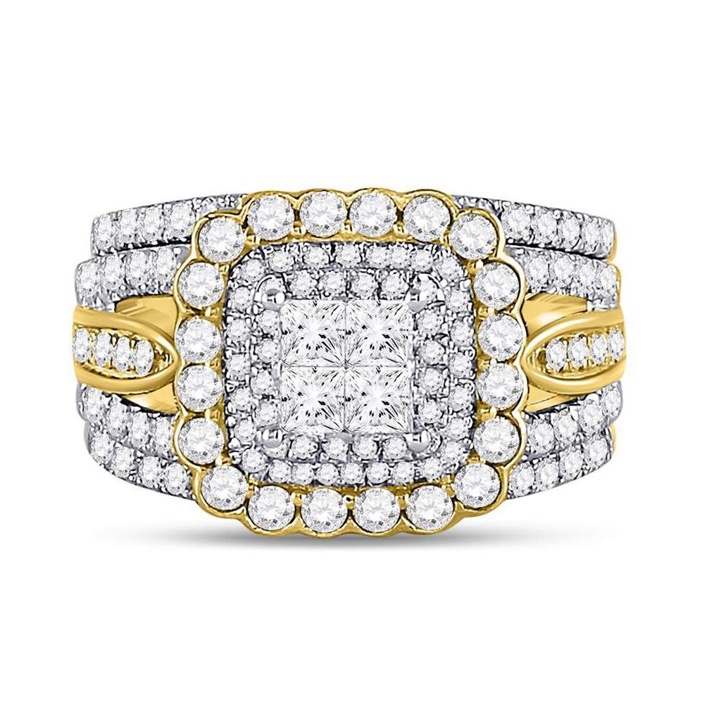 This bridal wedding ring set boasts a luxurious 14kt yellow gold construction with a total weight of 11.98 grams. The set features an exquisite display of gemstones with a total carat weight of 2, highlighted by a stunning princess-cut diamond as the primary gemstone. The diamond has a color grade of G-H and clarity grade of I1-I2, and is expertly set in an invisible setting. The set also includes round-cut diamonds in prong-settings with a total carat weight of 1.55. With its elegant design and exceptional quality, this bridal set is sure to make your special day unforgettable.