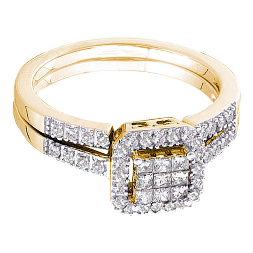 The '14k Yellow Gold Princess Diamond Bridal Wedding Ring Set 3/8 Cttw' is an exquisite piece of jewelry made of 14kt yellow gold, weighing approximately 4.676 grams. The remarkable ring boasts a total gemstone carat weight of 3/8 and features a beautiful princess-cut diamond as the primary gemstone, with a carat weight of 0.18. The diamond is a sparkling G-H color and has a clarity grade of I2, which complements the overall elegance of the piece. The primary gemstone is set in an invisible setting, creating a seamless and polished look. The ring also features a second diamond gemstone, which is round-cut, has a G-H color and a clarity grade of I1-I2, with a carat weight of 0.2, and is set in a prong setting. The third gemstone has no carat weight. This bridal wedding ring set is a magnificent choice for that special occasion, flaunting sheer perfection in its design and craftsmanship.
