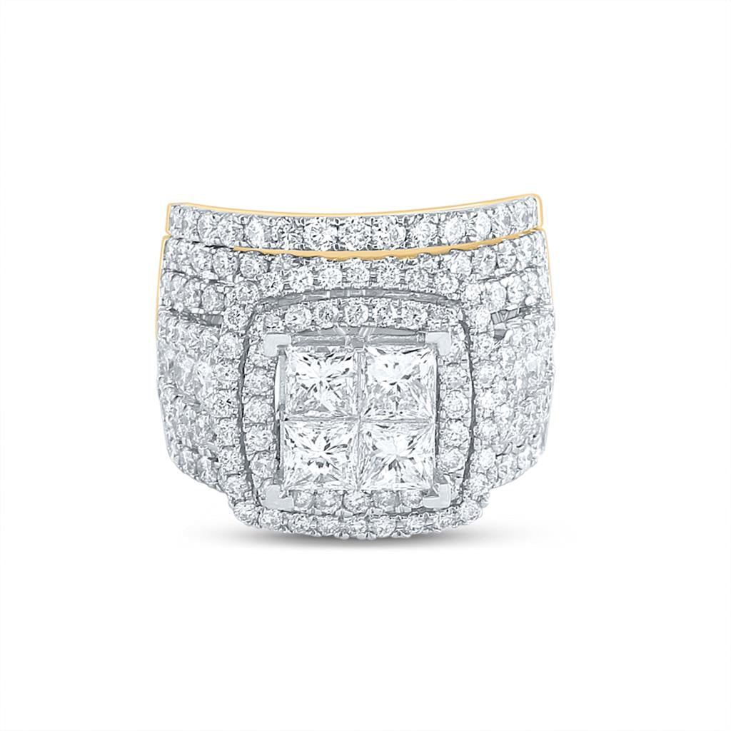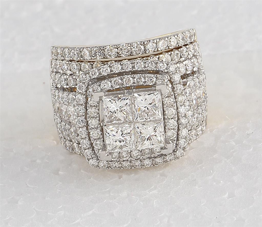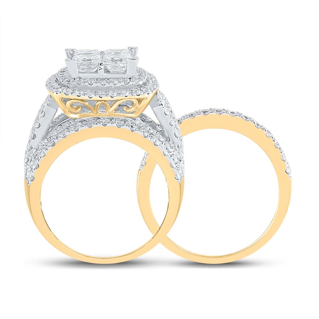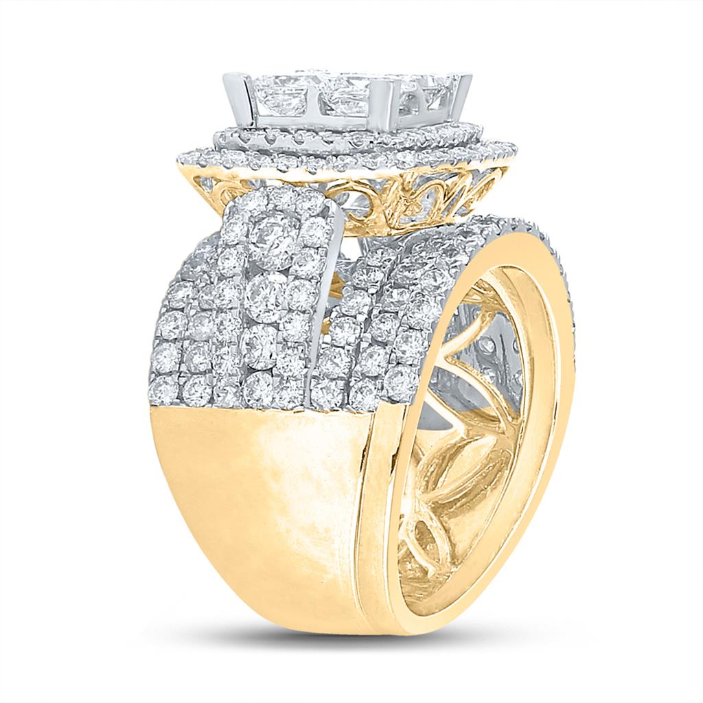 The '14k Yellow Gold Princess Diamond Bridal Wedding Ring Set 4-1/2 Cttw' is a stunning piece of jewelry that is crafted from 14kt yellow gold, weighing approximately 12.44 grams. This beautiful set is adorned with a total gemstone carat weight of 4 and 1/2, featuring a primary gem of princess diamond shape, in sparkling G-H color and clear clarity of I1-I2. The primary gem is delicately set in an invisible setting with a carat weight of 1.57, showcasing its beauty and brilliance. The set is also embellished with round-shaped diamonds, in G-H color and I1-I2 clarity, in a channel and prong setting, respectively. The smaller round diamonds have a total carat weight of 0.22, while the larger ones have an impressive carat weight of 2.78. This bridal wedding ring set exudes elegance and sophistication, making it the perfect choice for your special day or any grand occasion.