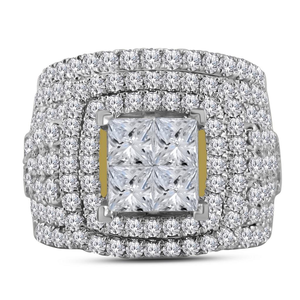 This exquisite bridal wedding ring set is crafted from high-quality 14kt yellow gold, weighing approximately 16.94 grams. Adorned with a total gemstone carat weight of 5, this set features a stunning princess diamond as the primary gem, with a G-H color and SI3 clarity, set in an invisible setting and with a carat weight of 1.48. The set also includes a round-cut diamond with a G-H color and I1-I2 clarity, weighing 3.5 carats, and set in a prong setting. With no additional gemstone, this ring set offers a glamorous and sophisticated design that is sure to become a cherished family heirloom.