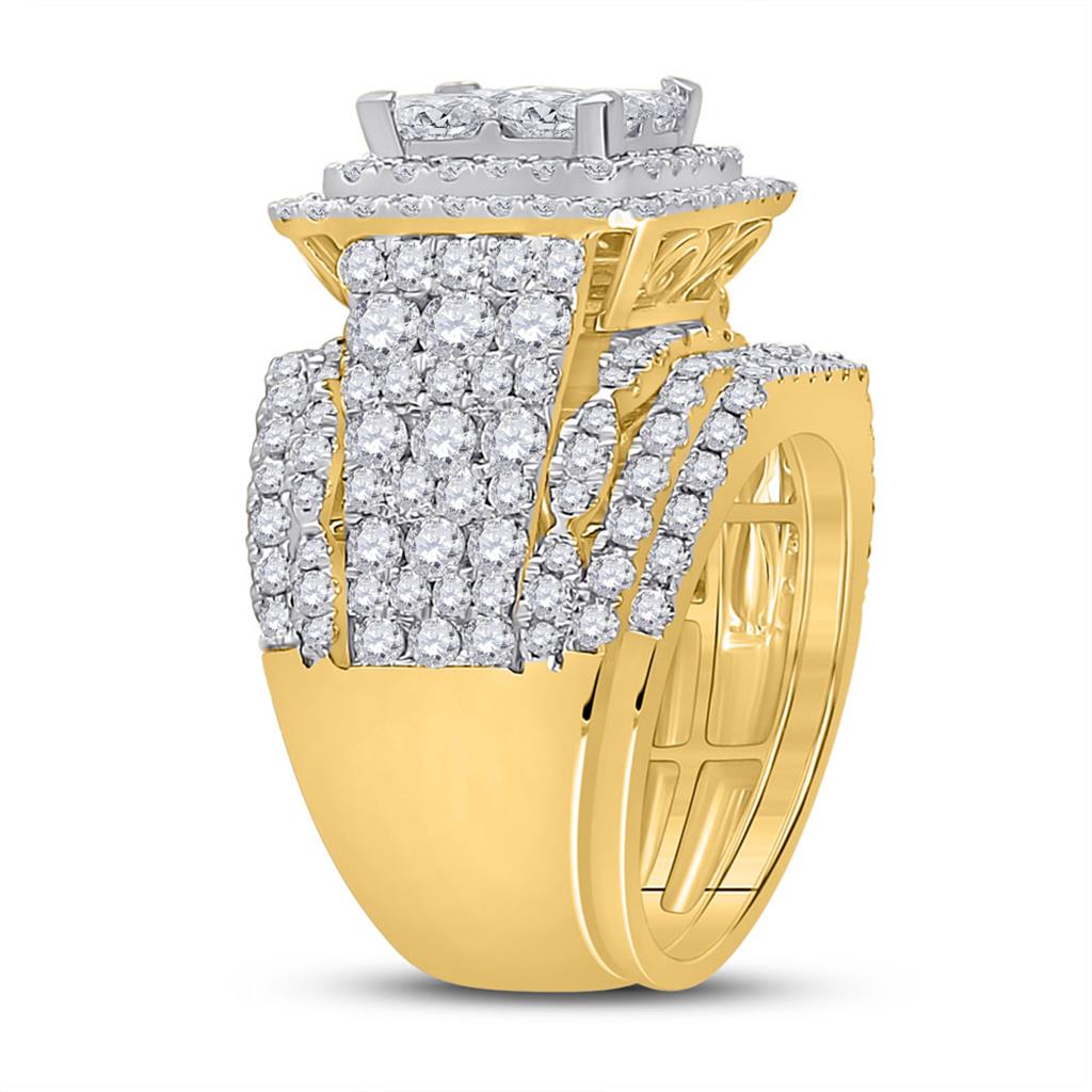 This stunning bridal wedding ring set is made of 14kt yellow gold with a weight of approximately 22.0732 grams. The total gemstone carat weight is an impressive 5, and the primary gem type is a beautiful princess cut diamond with a G-H color and SI1-SI2 clarity. The diamond is set in an invisible setting with a carat weight of 1.6. The set also includes two additional diamonds, both with a round cut, G-H color, and I1-I2 clarity. One diamond is pave-set with a carat weight of 2.43, while the other is channel-set with a carat weight of 1.04. This bridal wedding ring set is the perfect choice for a sophisticated and luxurious look.