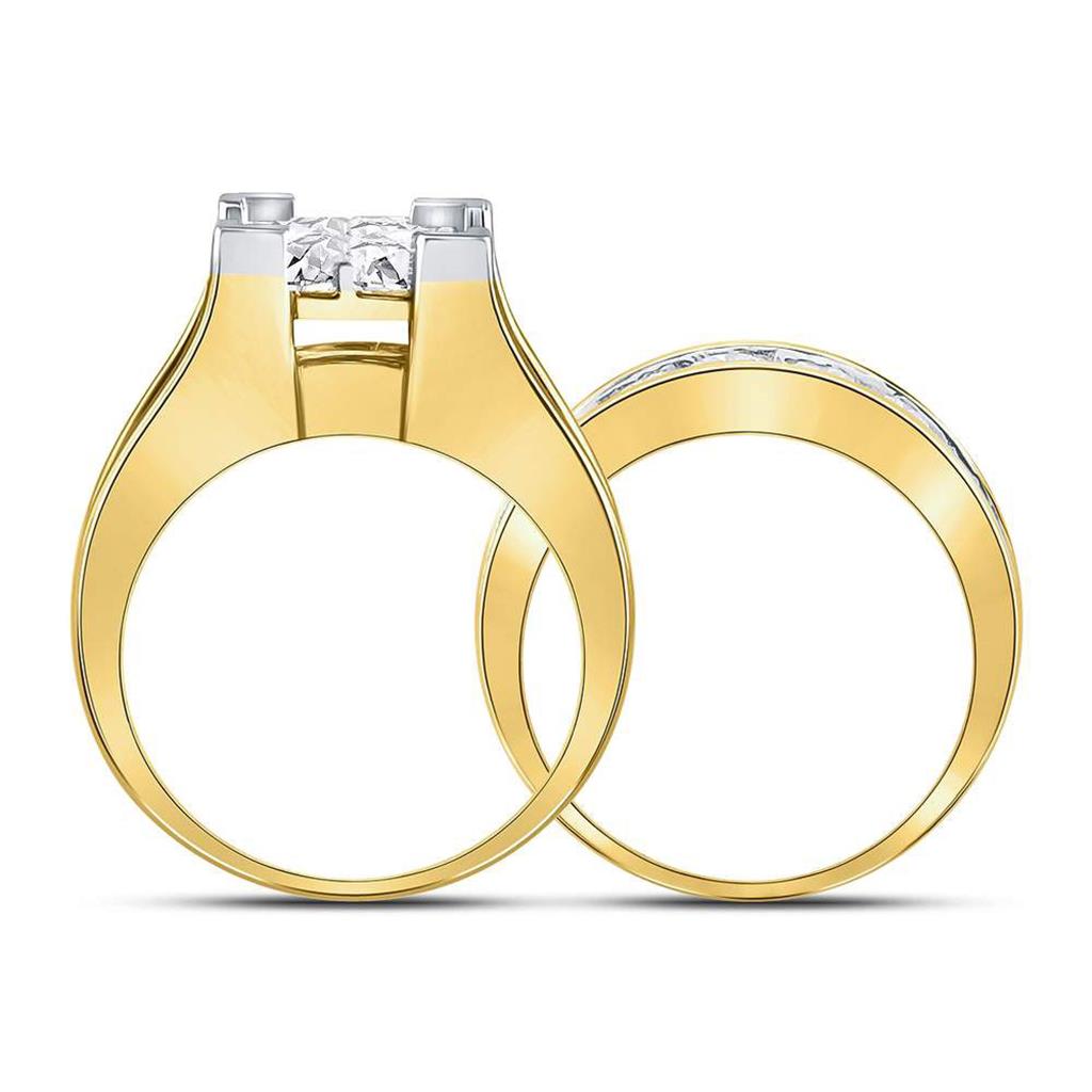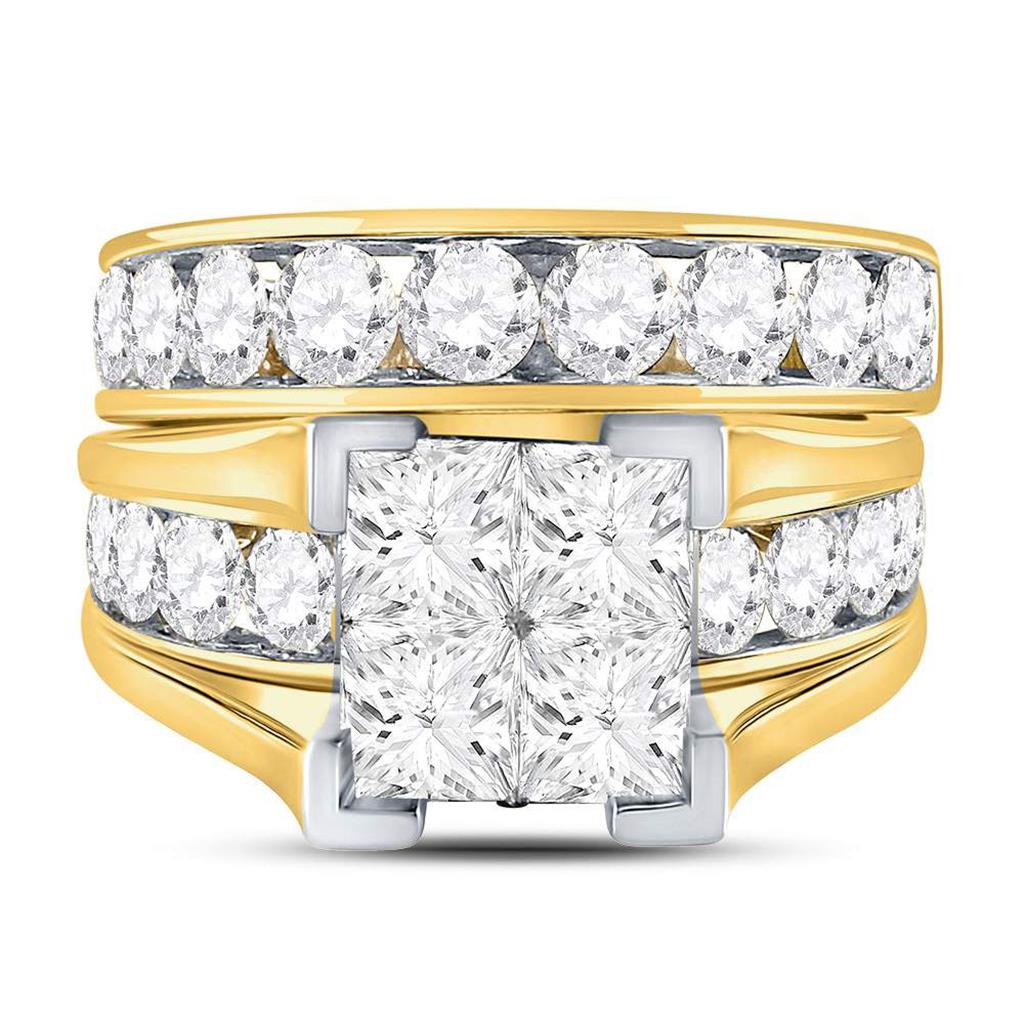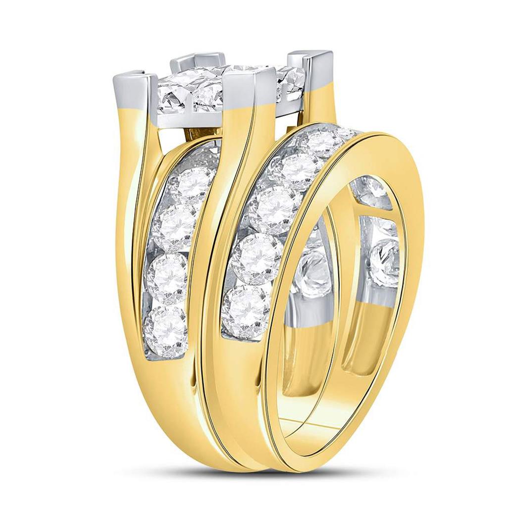 The '14k Yellow Gold Princess Diamond Bridal Wedding Ring Set 5 Cttw' is a magnificent piece of jewelry crafted from luxurious 14kt yellow gold. Weighing approximately 12.2 grams, this set features a stunning total gemstone carat weight of 5. The primary gem type is diamonds, with a princess shape, a gorgeous G-H color, and I1-I2 clarity, all set invisibly to truly highlight their beauty. The primary gem weighs 2 carats, while the second diamond gem, with a round shape, G-H color, and I1-I2 clarity, is set in a channel, and weighs 3 carats. The third gem has no carat weight. This ring set is the perfect choice for your special day.