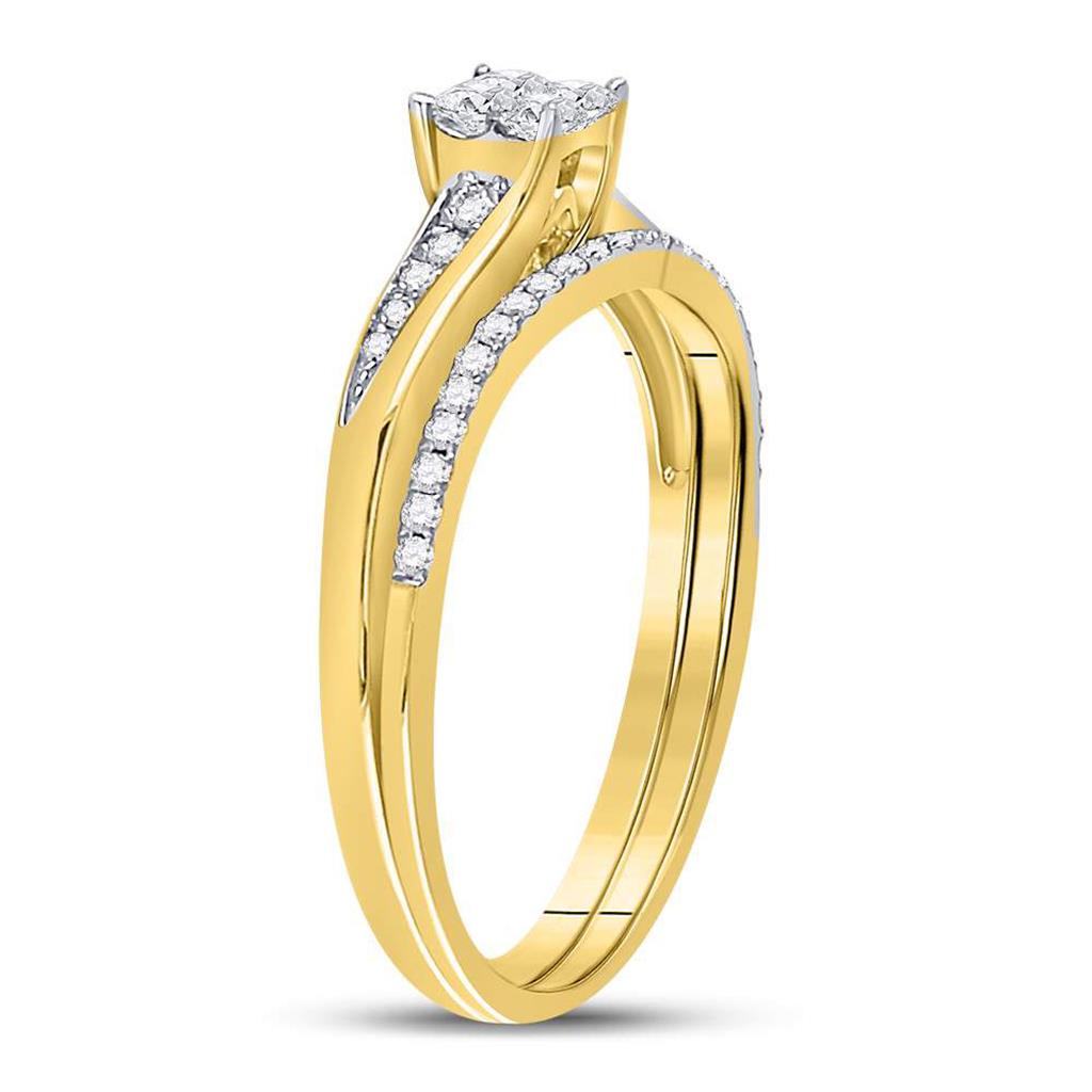 Introducing our exquisite 14k Yellow Gold Princess Diamond Cluster Bridal Wedding Ring Set, showcasing a total gemstone carat weight of 1/3. Crafted from high-quality 10kt yellow gold, this set has an approximate gram weight of 2.719. The primary gemstone in this set is a stunning princess-shaped diamond, with a G-H color rating and I1-I2 clarity, expertly set in an invisible setting. The princess diamond has a carat weight of 0.18. The second gemstone in this set is a round diamond, also with a G-H color rating and I1-I2 clarity, set in a prong setting. With a carat weight of 0.18, this second diamond adds an eye-catching element to the overall design. There is no third gemstone in this set. Perfect for brides who desire a luxurious, sophisticated look for their wedding day, this 14k Yellow Gold Princess Diamond Cluster Bridal Wedding Ring Set is sure to impress.