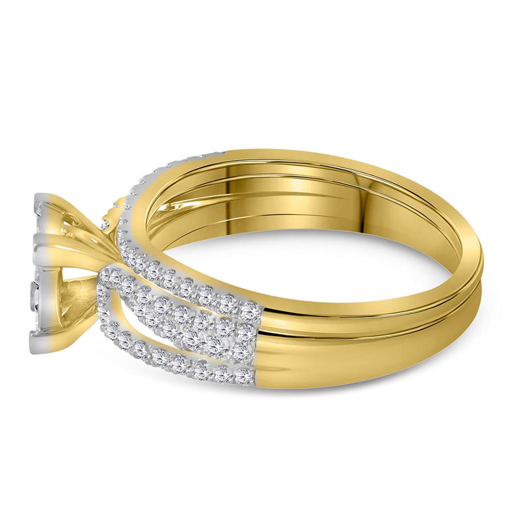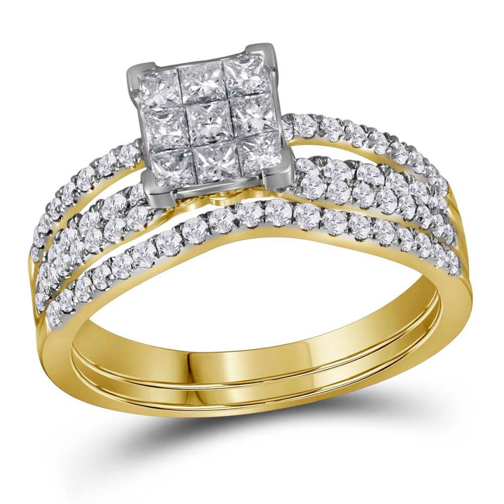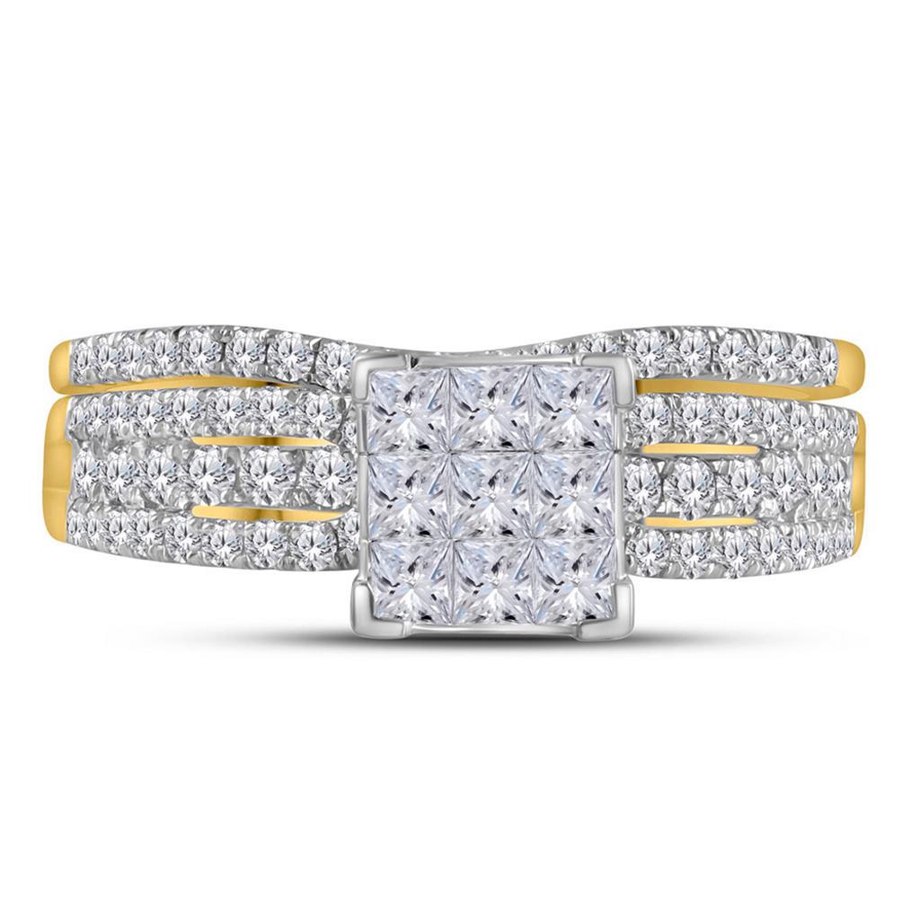 The '14k Yellow Gold Princess Diamond Cluster Bridal Wedding Ring Set 1 Cttw' is a stunning piece of jewelry. Crafted in 14kt yellow gold, this ring set weighs approximately 4.4912 grams and boasts a total gemstone carat weight of 1. The primary gem is a princess-shaped diamond in a G-H color grade, with a clarity grade of I1-I2, and is set invisibly for maximum sparkle. The ring also features a round diamond with a G-H color grade, a clarity grade of I2, and a prong setting with a carat weight of 0.57. This gorgeous ring set is perfect for any special occasion, particularly weddings, and will surely make the bride feel like a princess.