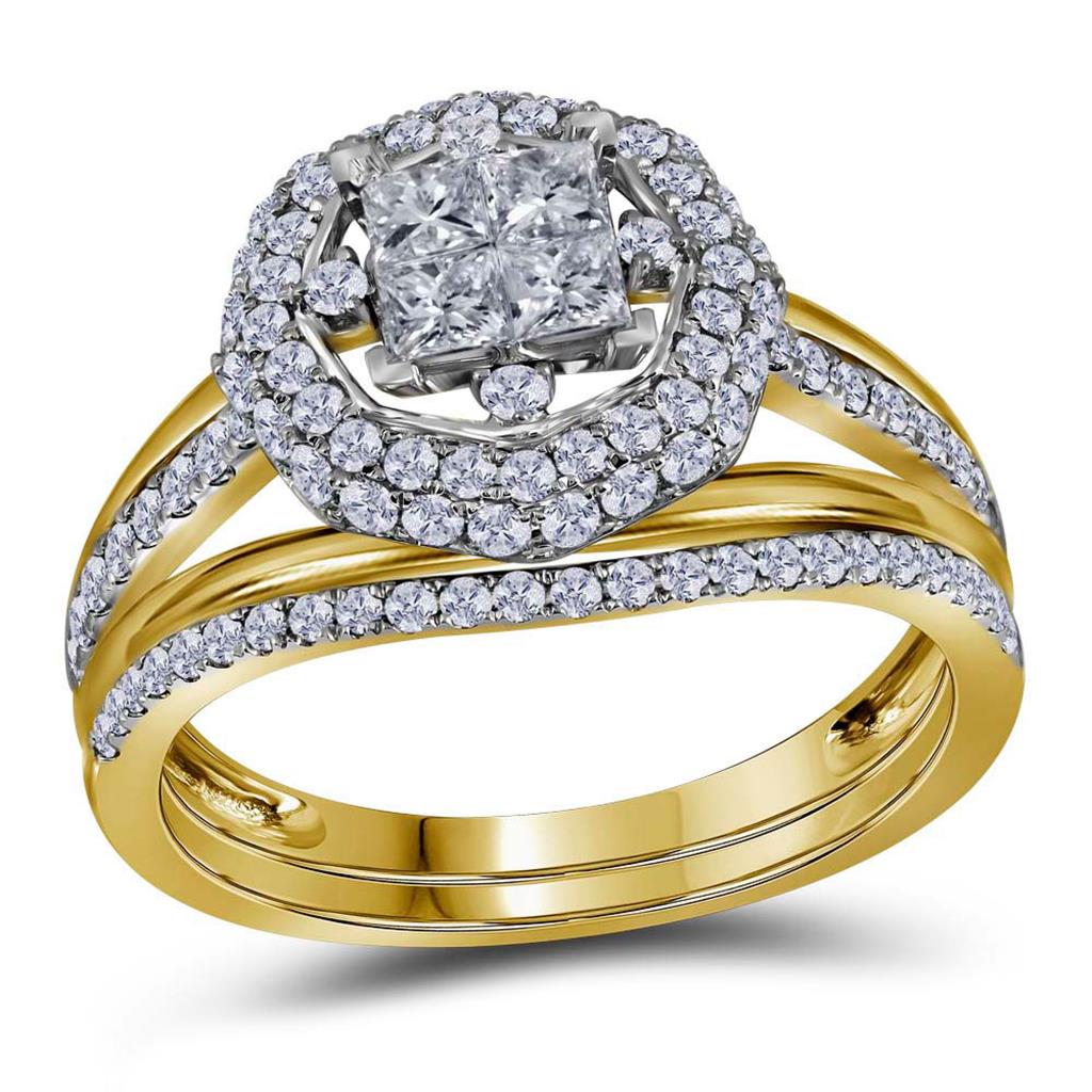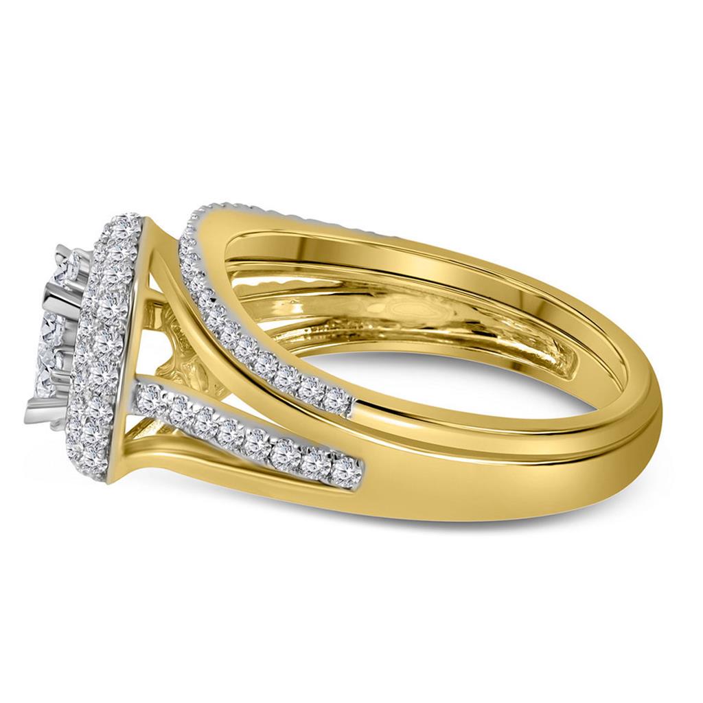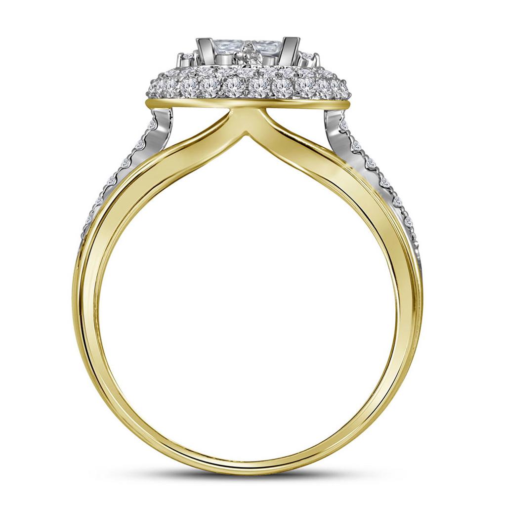 The '14k Yellow Gold Princess Diamond Halo Bridal Wedding Ring Set 1 Cttw' is an exquisite piece of jewelry made from 14kt yellow gold with a total gemstone carat weight of 1. The ring features a stunning princess-cut diamond as the primary gem, set in an invisible setting, with a G-H color and I1-I2 clarity, and a carat weight of 0.4. The ring also has two additional diamonds, one round diamond set in a pave setting with a G-H color and I2-I3 clarity, with a carat weight of 0.37, and another round diamond set in a prong setting with a G-H color and I2-I3 clarity, with a carat weight of 0.29. This bridal wedding ring set is truly a precious and elegant piece of jewelry, perfect for a special occasion or as a gift for a loved one.