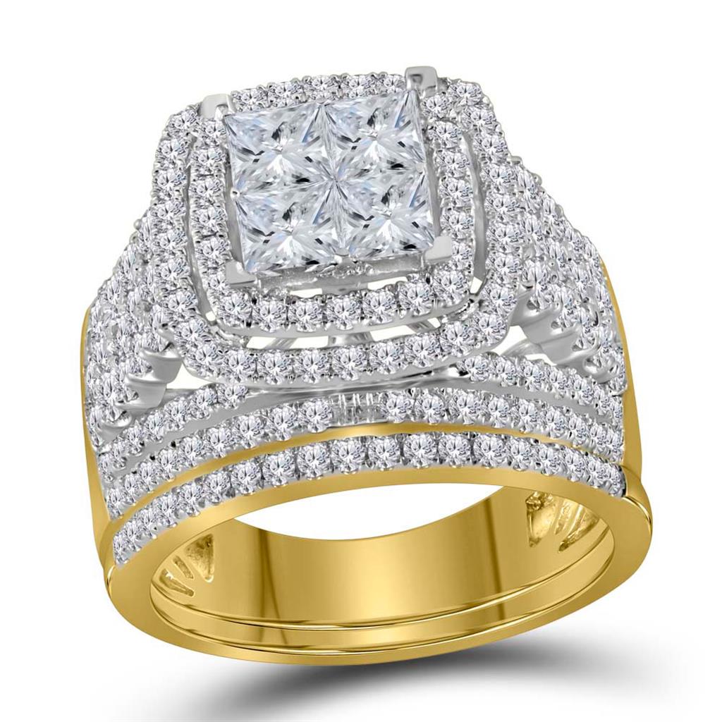 This is a gorgeous 14kt yellow gold bridal wedding ring set with a princess diamond halo design and a total gemstone carat weight of 3. The ring set weighs approximately...