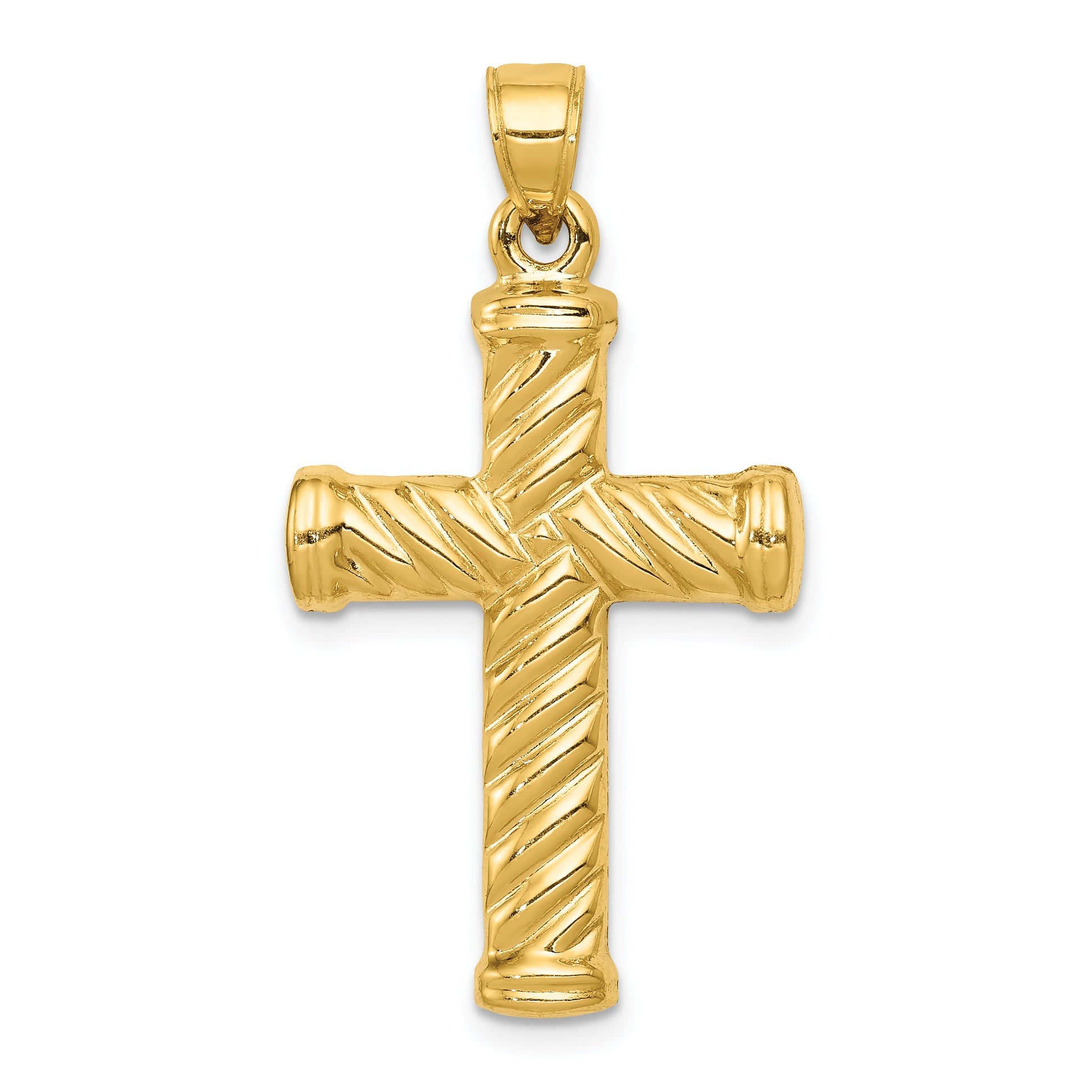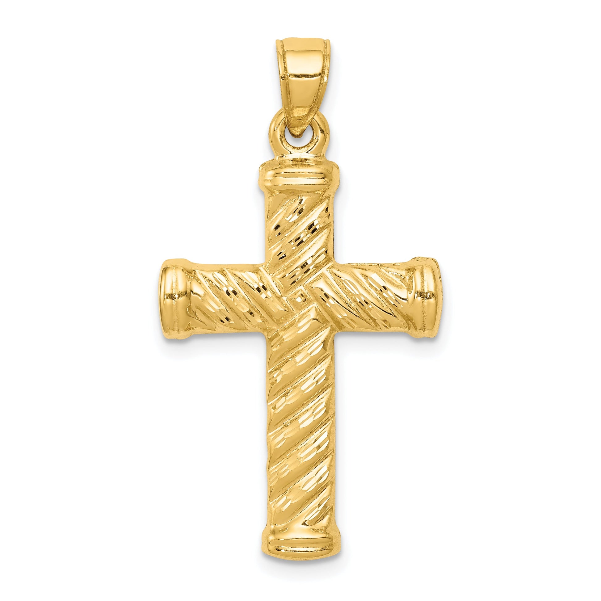 Discover serenity and elegance with the 14K Yellow Gold Reversible Diamond-Cut Cross Pendant. Made from high-quality 14K yellow gold, this pendant showcases a polished finish that artfully reflects light. Measuring 35 mm in length and 19 mm in width, the cross features a unique reversible design with intricate diamond-cut detailing. Ideal for those seeking a versatile piece, the pendant also includes a sturdy bail for easy attachment. This timeless jewelry piece promises to add a touch of grace to your collection. Elevate your style with the 14K Yellow Gold Reversible Diamond-Cut Cross Pendant.