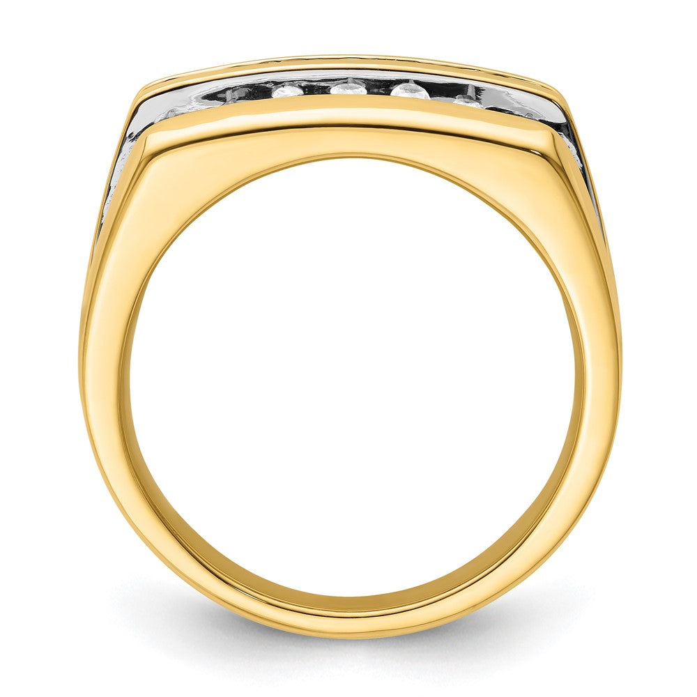 Get ready to make a statement with the 14k Yellow Gold Rhodium-plated Men's Ring. This stunning piece showcases 1 1/6 carat of lab-grown diamonds, offering exceptional brilliance with VS/SI+ clarity and G+ color. The ring features a polished finish, with 11 round diamonds at 2.3 mm and 14 round diamonds at 2.2 mm, securely nestled in a 10.91 mm wide band. The cluster head design, complemented by a flat top, gives it an edge. Perfect for those who value sustainability and style, this ring is a true fashion must-have.