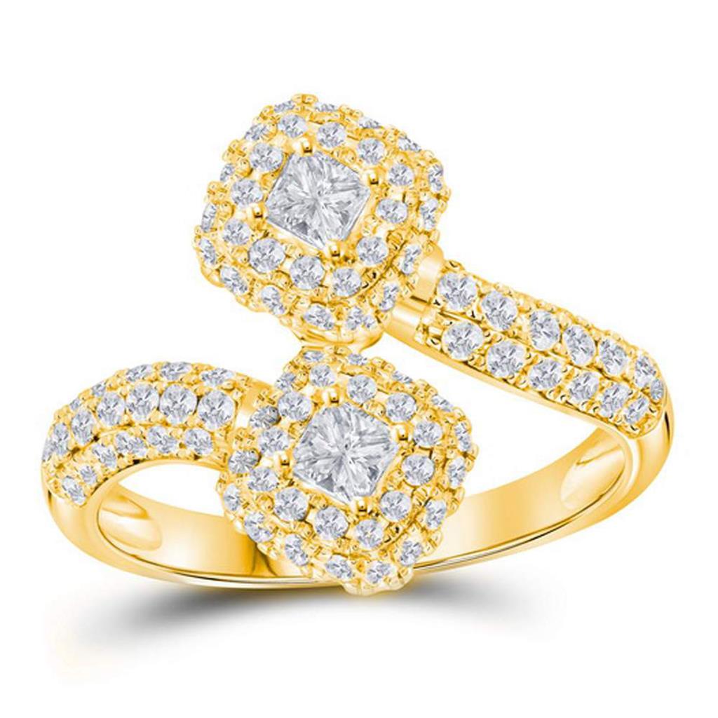 This divine 14kt yellow gold 2-stone bridal engagement ring is adorned with round diamonds that sparkle with a gemstone carat weight of 3/4. The ring has a precious metal weight of 2.76 grams, making it impressively sturdy. The princess-cut primary diamond of G-H color and I1 clarity is prong-set and has a carat weight of 0.2. The second diamond, a round cut of G-H color and I1-I2 clarity, is also prong-set, flaunting a carat weight of 0.55. This enchanting ring is certified and elevated to the highest degree of excellence. Gemstone carat weight of the third gem, if any, is not specified but is irrelevant to the stunning sophistication of this 2-stone bridal engagement ring.