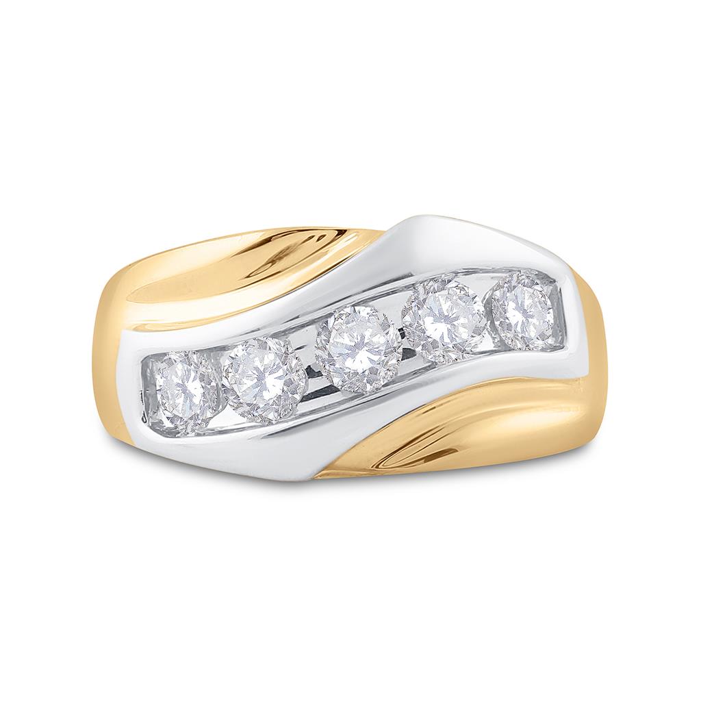Introducing our stunning 14k Yellow Gold Round Diamond 5-Stone Band Ring, featuring a total gemstone carat weight of 1. Crafted from precious 14kt yellow gold, this ring weighs approximately 9.18 grams. It boasts a gorgeous round diamond as its primary gemstone, with a G-H color and I1-I2 clarity, beautifully channel-set and weighing 0.99 carats. This exquisite piece makes for an exquisite addition to any jewelry collection. Please note that this ring does not include additional gemstones.