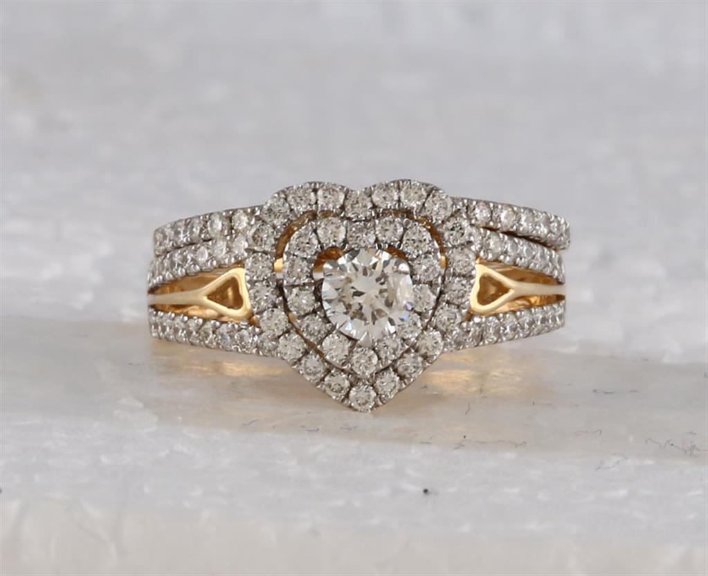 This certified bridal wedding ring set is made from 14kt yellow gold and weighs approximately 4.44 grams. Featuring a total gemstone carat weight of 1 and 1/5, the primary gem...