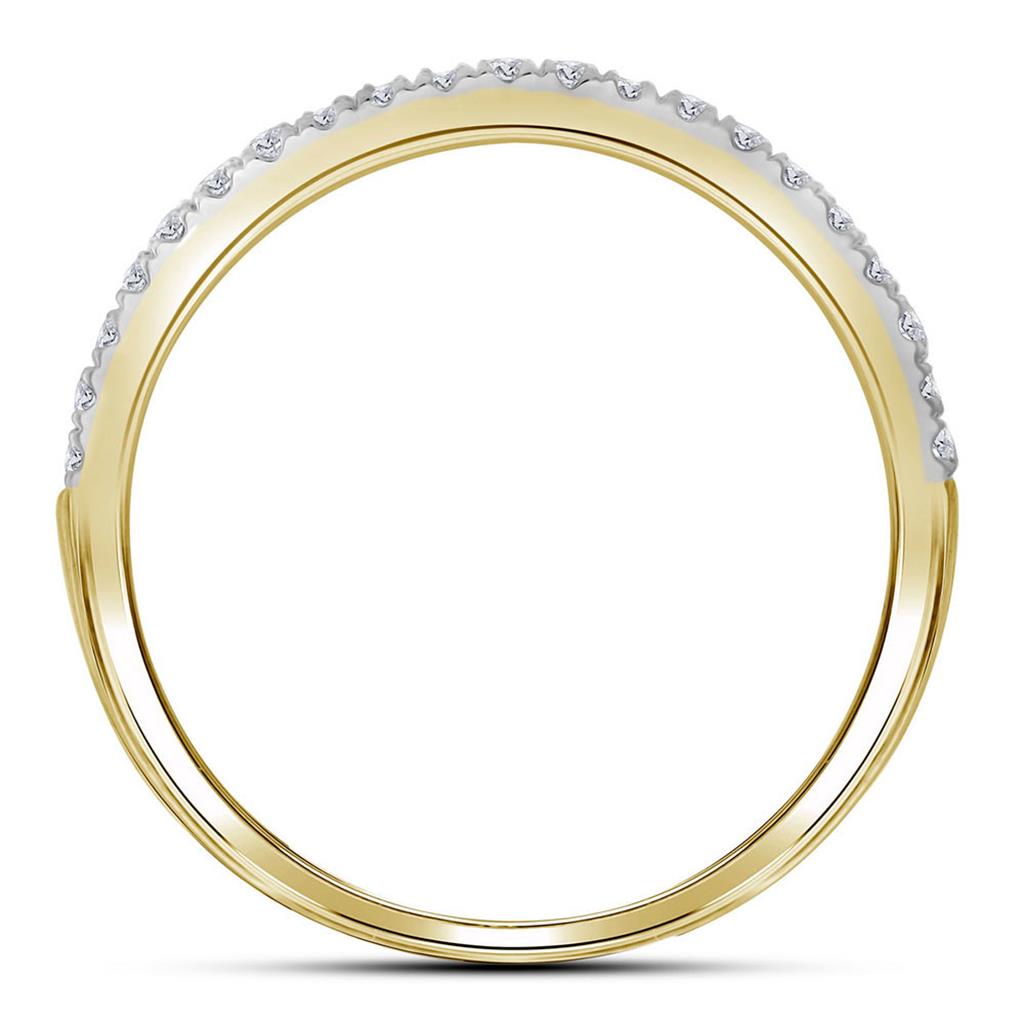 This is a beautiful set of matching wedding rings made from 14 karat yellow gold. The rings have a total of 1 carat of diamonds, with the largest diamond being 0.1 carats and the others being 0.95 carats altogether. The diamonds are all round in shape and are set securely in the rings using prongs. The diamonds have a G-H color rating and a clarity rating of I1-I2.