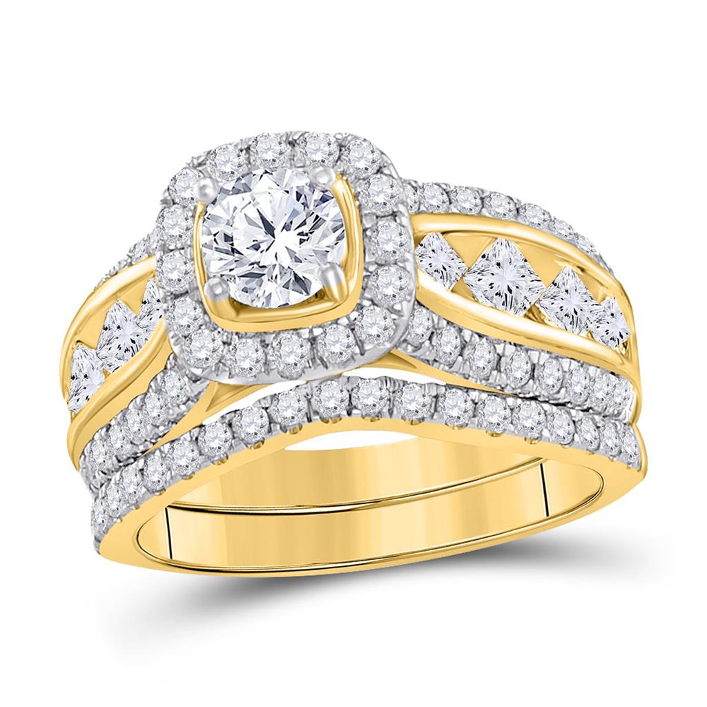 Experience the timeless elegance of this certified 14k Yellow Gold Round Diamond Bridal Wedding Ring Set, expertly crafted to capture the beauty of true love. With a total gemstone carat weight of 2 and 1/4, this stunning set is adorned with three high-quality diamonds in varying shapes and sizes. The primary gem features a captivating round shape, with a color grade of G-H and clarity rating of I1, set in a secure 4-prong setting with a carat weight of 0.89. The second gem boasts a regal princess shape, with a color grade of G-H and clarity rating of I1-I2, set in a sleek channel setting with a carat weight of 0.61. The final gem showcases another radiant round shape, with a color grade of G-H and clarity rating of I1-I2, set in a sophisticated prong setting with a carat weight of 0.75. With a total gold weight of approximately 7.6502 grams, this bridal wedding ring set is a precious investment that will shine for generations to come.