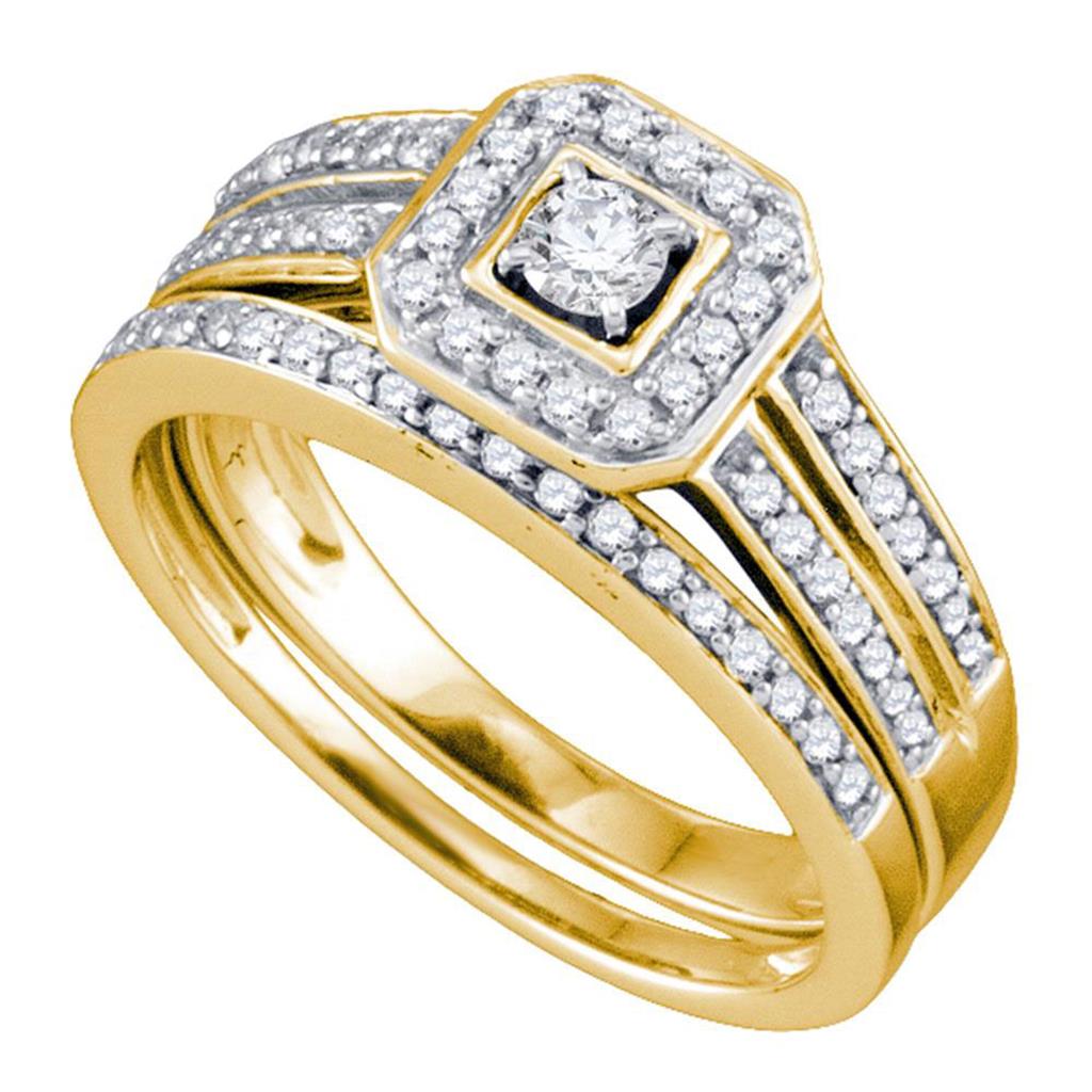 14k Yellow Gold Round Diamond Square Halo Bridal Wedding Ring Set 1/2 Cttw