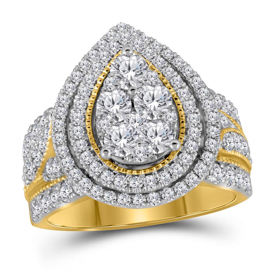 This stunning bridal engagement ring is made of 14kt yellow gold and weighs approximately 8.47 grams. It features a teardrop-shaped design with a total gemstone carat weight of 2. The...
