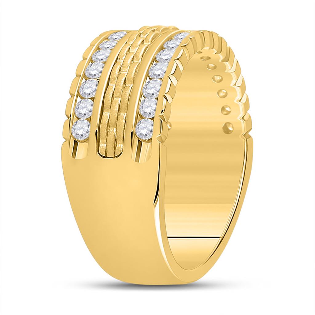 This 14k yellow gold wedding band ring features a round diamond totaling 1 carat. The precious metal weight is approximately 12.7804 grams, and the channel-set diamond is of G-H color...