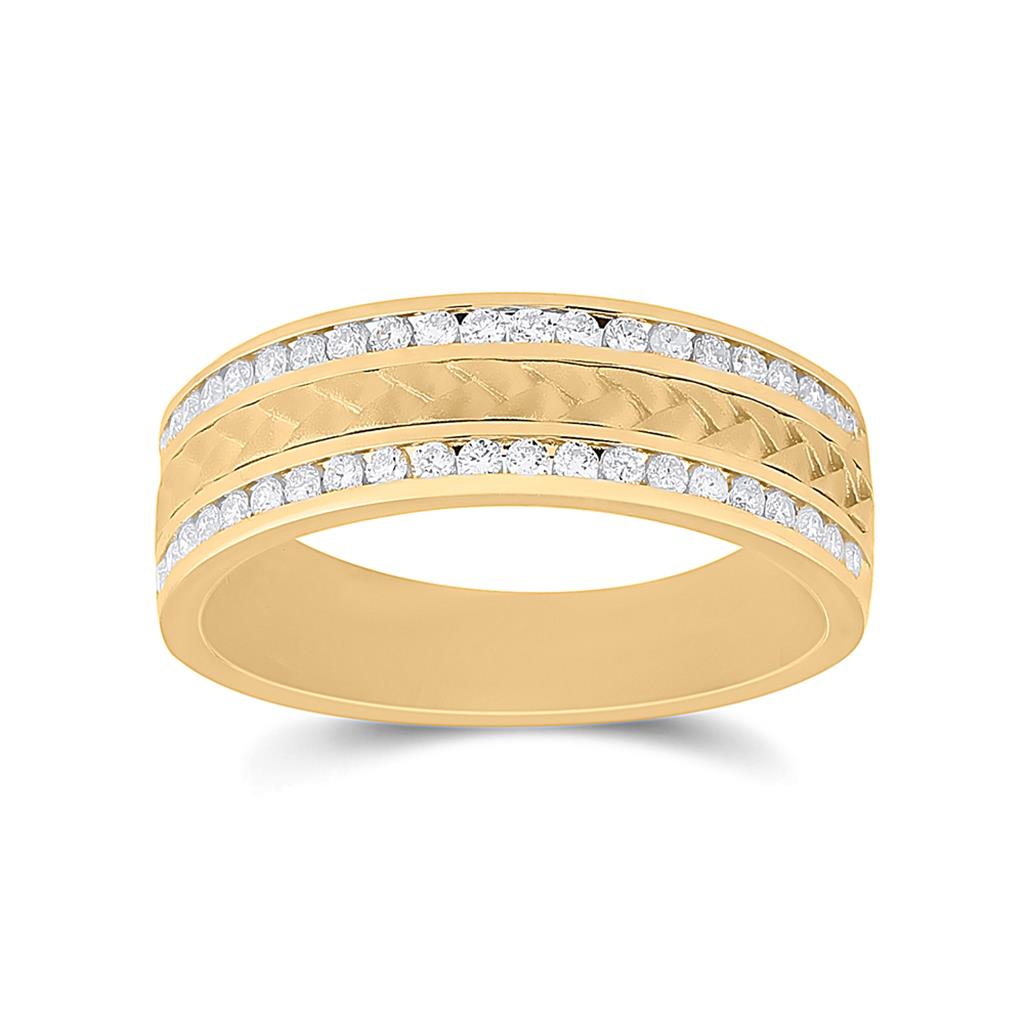 This stunning wedding ring is made of 14kt yellow gold and weighs approximately 10.75 grams. It features a beautiful round diamond that has a total carat weight of 3/4. The diamond is G-H in color and has a clarity of I1-I2. It is channel-set for a secure and elegant look. The ring does not have any additional gemstones besides the main diamond. This band has a hammered texture which adds a unique and stylish touch to this timeless piece of jewelry.