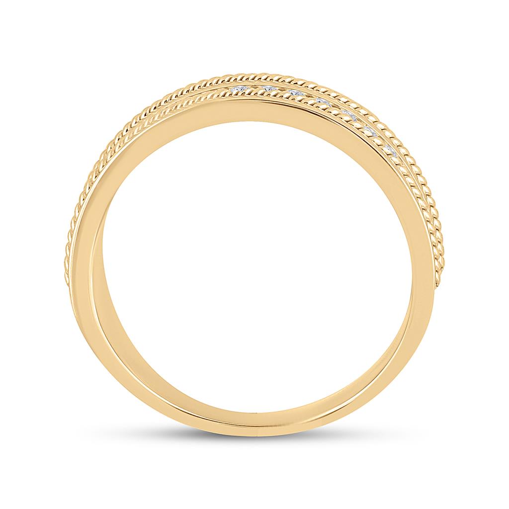 The 14k Yellow Gold Round Diamond Wedding Rope Band Ring is a stunning piece of jewelry that boasts a total gemstone carat weight of 1/3. Made with 14kt yellow gold, the ring has an approximate gram weight of 7.9466. The primary gem type is a glittering diamond, shaped round to catch the eye. The diamond's color is a beautiful G-H, and its clarity falls between I1-I2. The diamond is channel-set, showcasing its brilliance to perfection. The primary gem has a carat weight of 0.33, while there are no additional gems in the ring. This elegant ring will make a perfect addition to any jewelry collection and is perfect as a wedding band or for any special occasion.