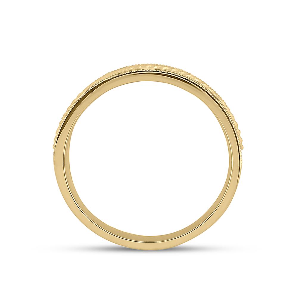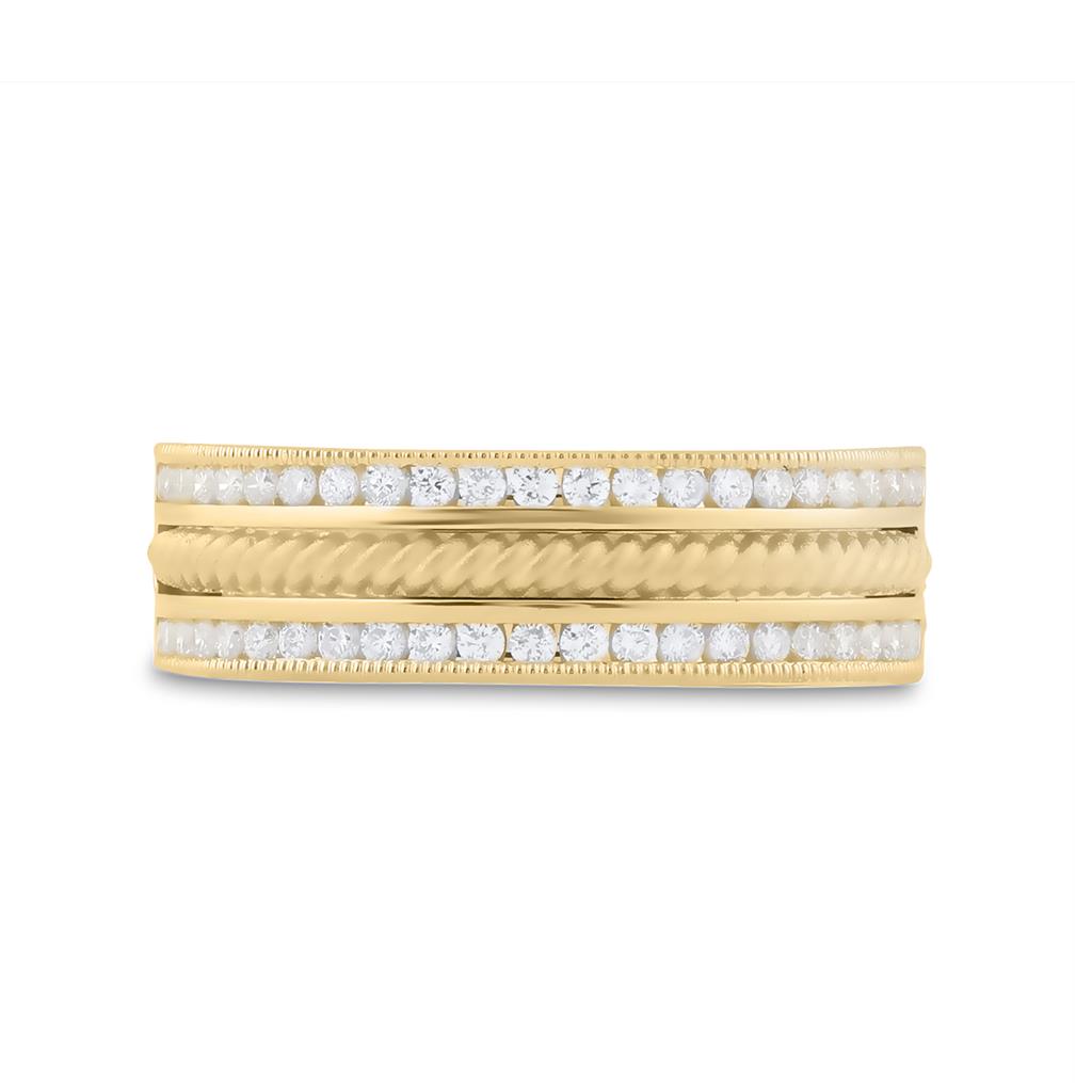 The '14k Yellow Gold Round Diamond Wedding Rope Inlay Band Ring 1/2 Cttw' is an exquisite piece of jewelry crafted from precious 14kt yellow gold with an approximate weight of 7.80008 grams. The ring boasts a stunning 1/2 carat total gemstone weight with a round shaped, G-H colored diamond as its primary gemstone. The diamond is channel-set to enhance its I1-I2 clarity and is complemented by a captivating rope inlay design. With no additional gemstones, this ring is a beautiful expression of simplicity and sophistication. Perfect for any special occasion, especially for weddings.