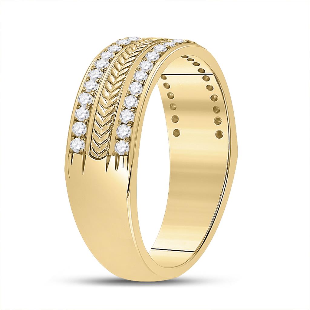 This exquisite product is a 14k yellow gold wedding band ring set with round diamonds, with a total carat weight of 1/2. The ring weighs approximately 7.65 grams, with the...